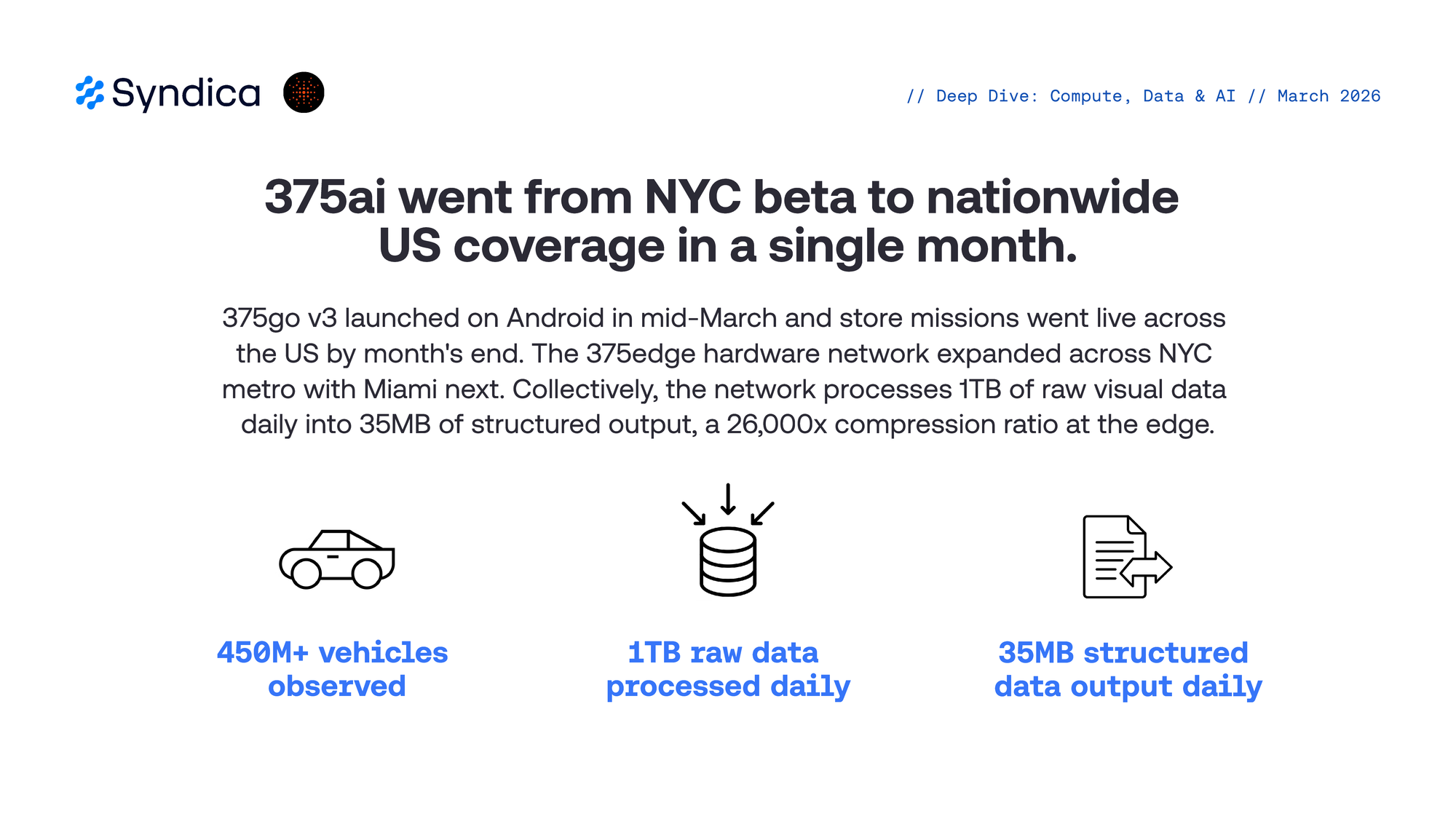 375go v3 launched on Android in mid-March and store missions went live across the US by month's end. The 375edge hardware network expanded across NYC metro with Miami next. Collectively, the network processes 1TB of raw visual data daily into 35MB of structured output, a 26,000x compression ratio at the edge.