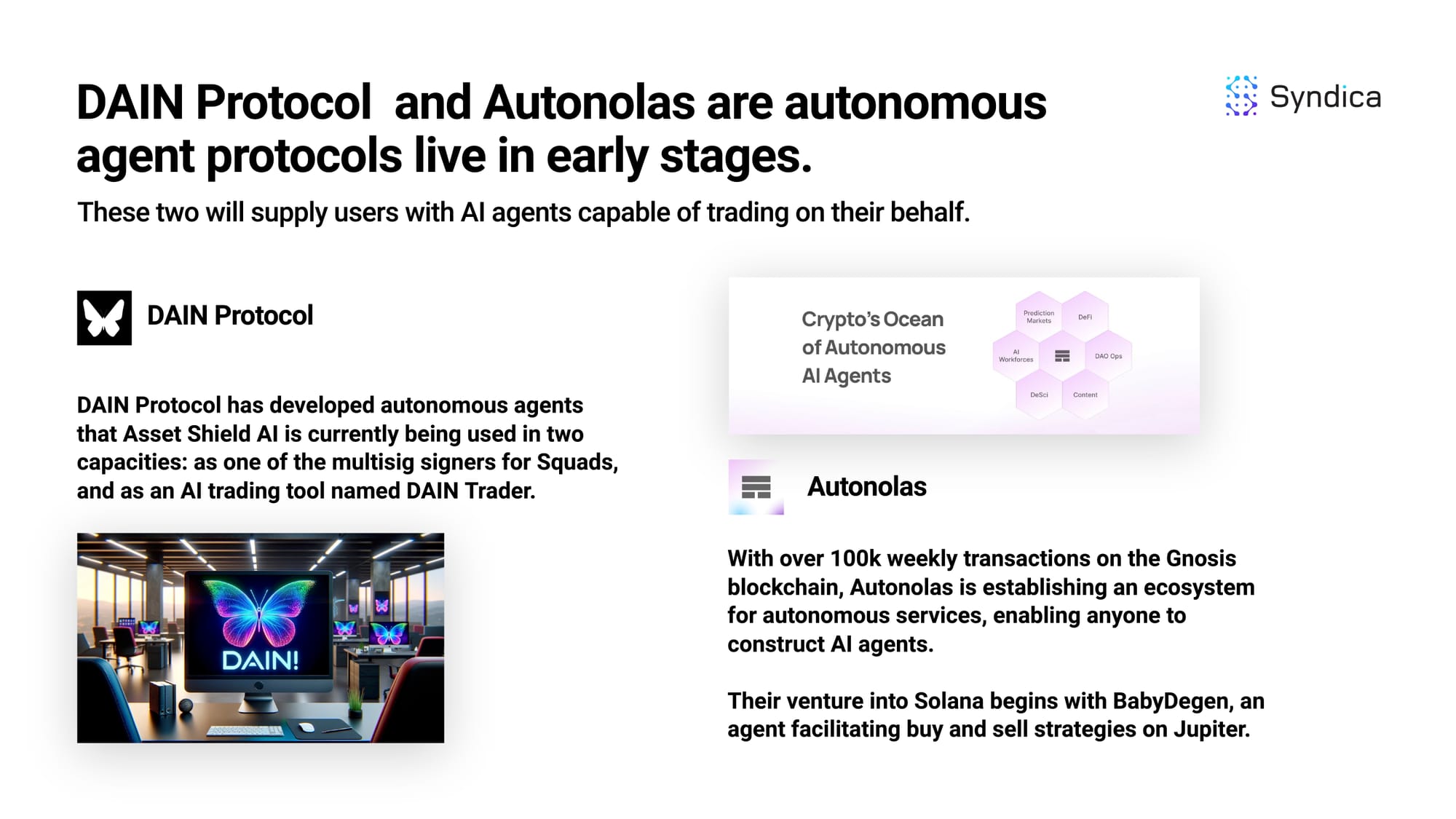 DAIN Protocol and Autonolas are autonomous agent protocols live in early stages. These two will supply users with AI agents capable of trading on their behalf.