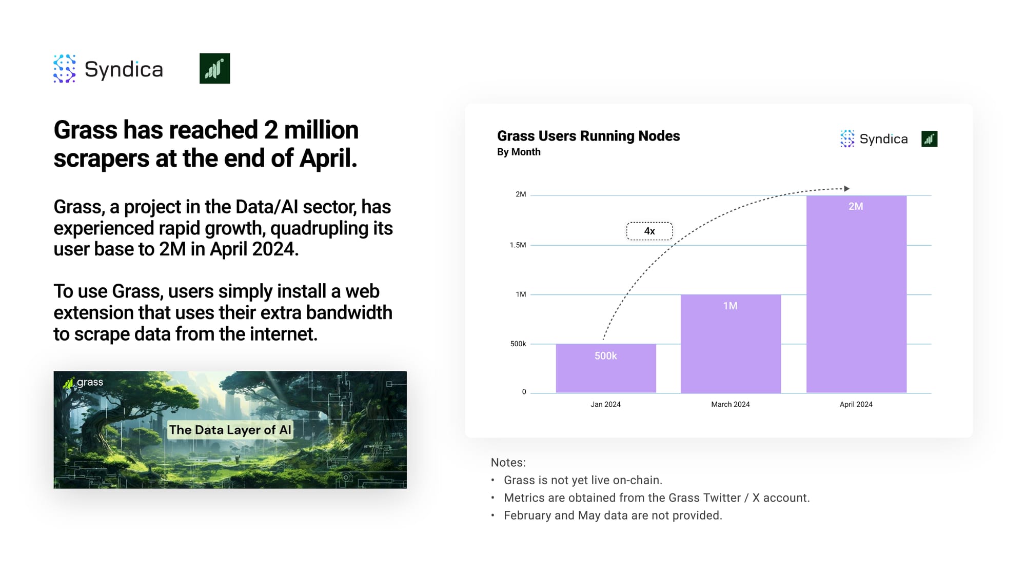 Grass has reached 2 million scrapers at the end of April. Grass, a project in the Data/AI sector, has experienced rapid growth, quadrupling its user base to 2M in April 2024.