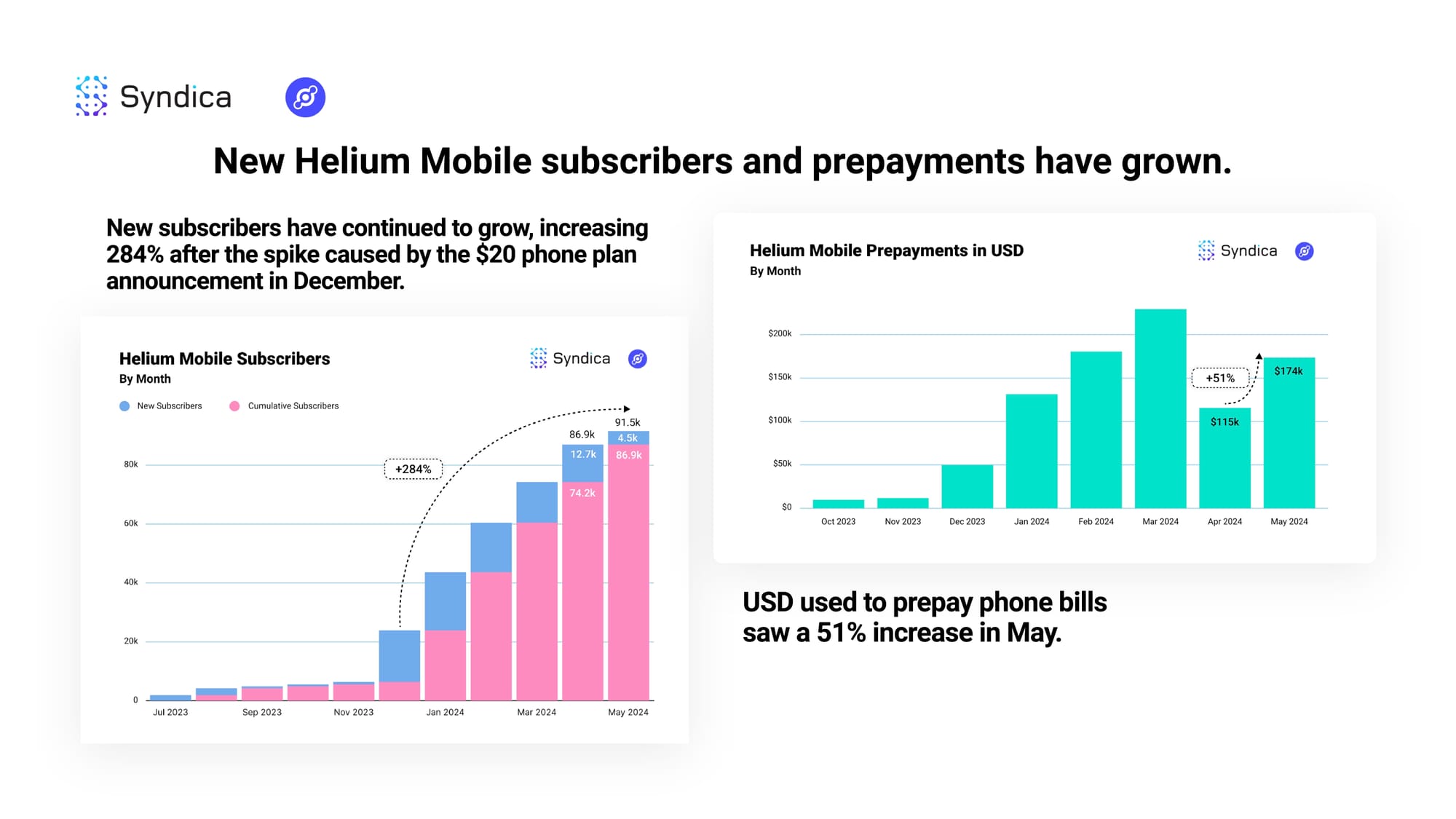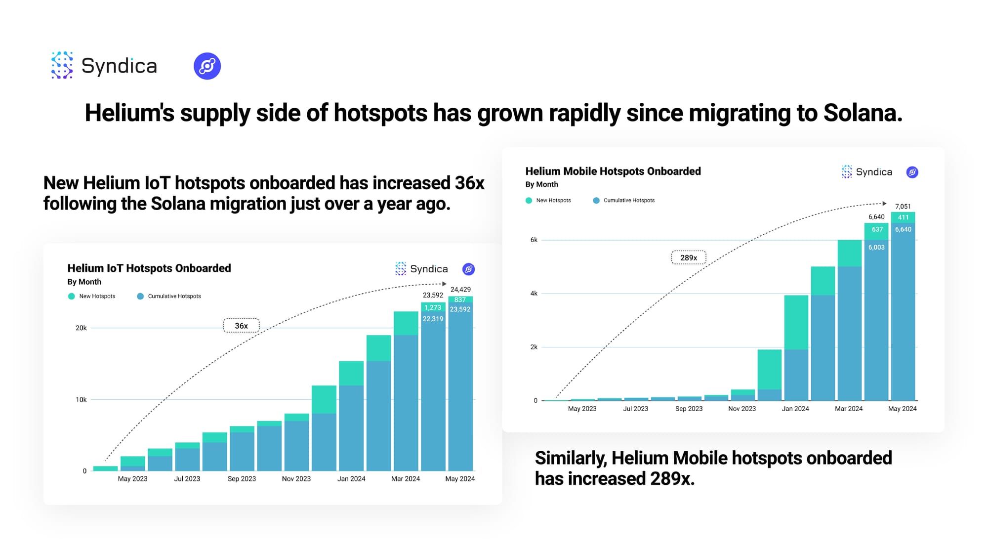 Helium's supply side of hotspots has grown rapidly since migrating to Solana. New Helium IoT hotspots onboarded has increased 36x following the Solana migration just over a year ago. Similarly, Helium Mobile hotspots onboarded has increased 289x.