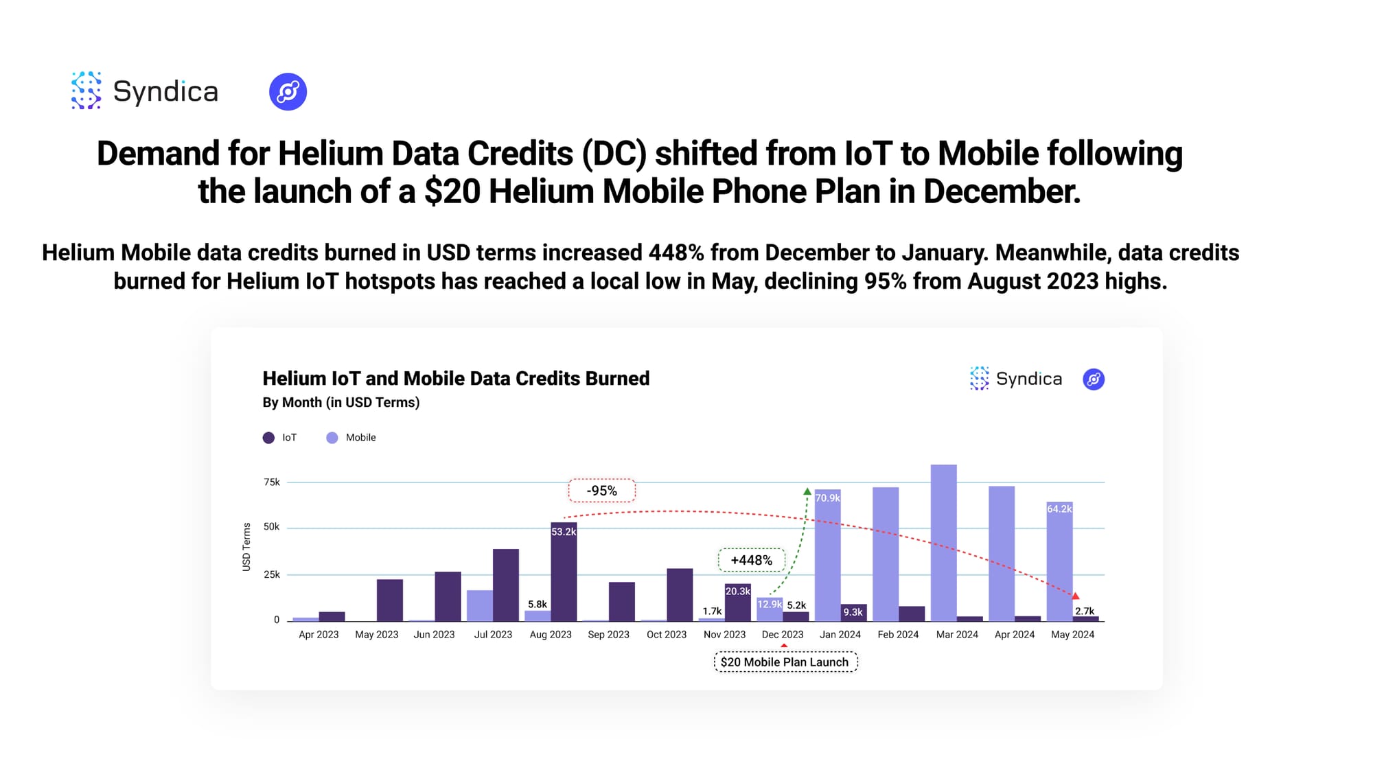 Demand for Helium Data Credits (DC) shifted from IoT to Mobile following the launch of a $20 Helium Mobile Phone Plan in December. Helium Mobile data credits burned in USD terms increased 448% from December to January. Meanwhile, data credits burned for Helium IoT hotspots has reached a local low in May, declining 95% from August 2023 highs.