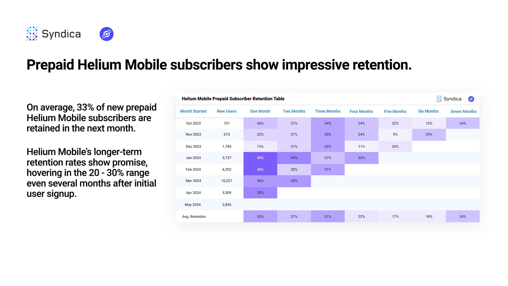 Prepaid Helium Mobile subscribers show impressive retention. On average, 33% of new prepaid Helium Mobile subscribers are retained in the next month. Helium Mobile's longer-term retention rates show promise, hovering in the 20 - 30% range even several months after initial user signup.