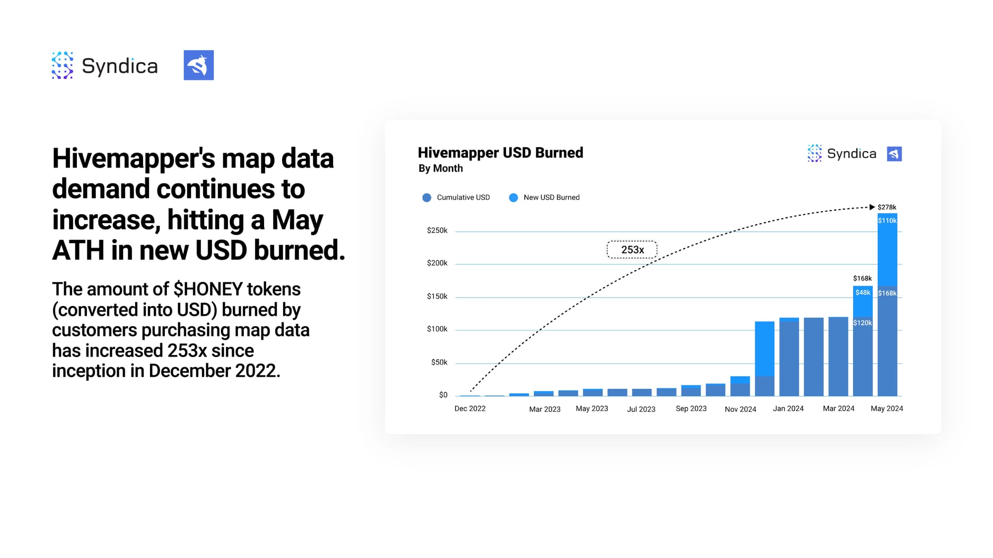 Hivemapper's map data demand continues to increase, hitting a May ATH in new USD burned. The amount of $HONEY tokens (converted into USD) burned by customers purchasing map data has increased 253x since inception in December 2022.