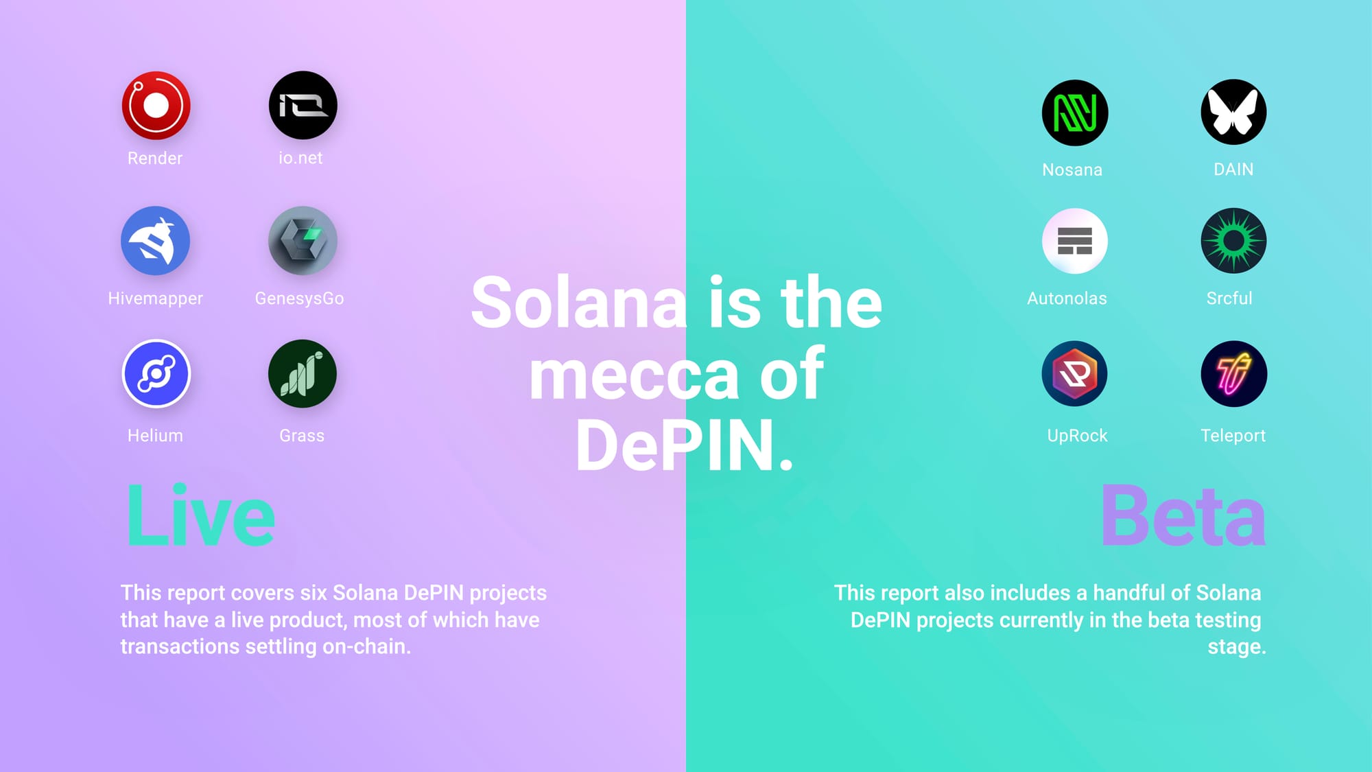 Live: This report covers six Solana DePIN projects that have a live product, most of which have transactions settling on-chain. Beta: This report also includes a handful of Solana DePIN projects currently in the beta testing stage.
