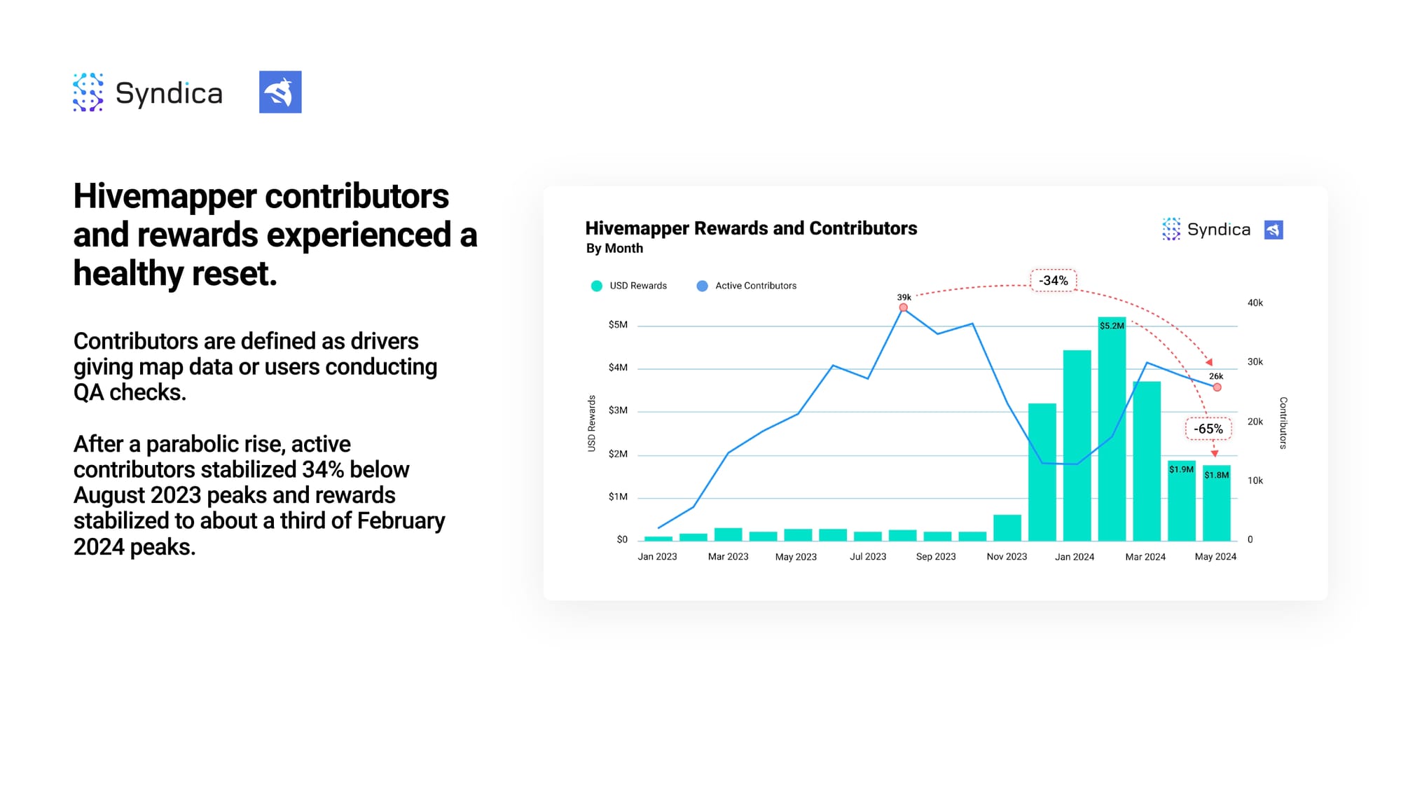 Hivemapper contributors and rewards experienced a healthy reset. Contributors are defined as drivers giving map data or users conducting QA checks.
