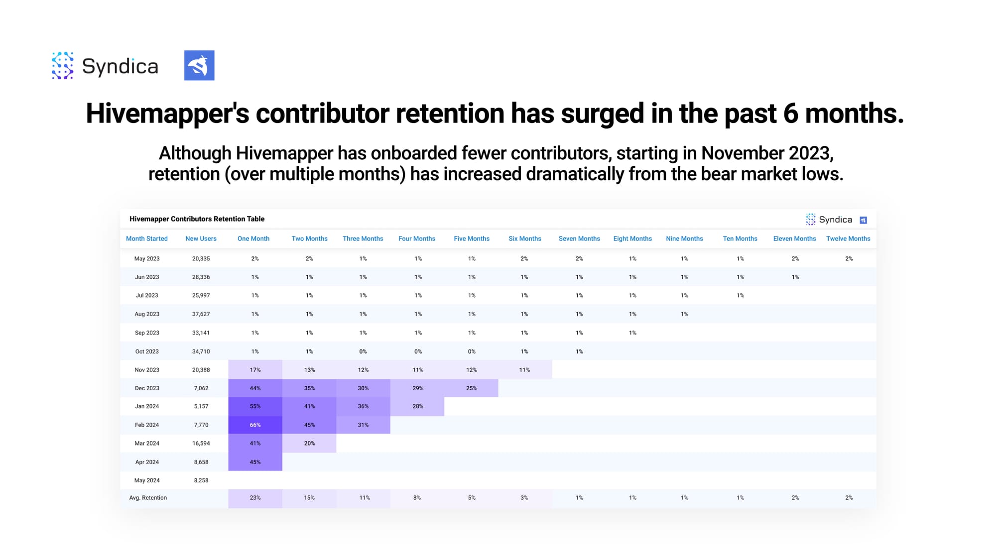 Hivemapper's contributor retention has surged in the past 6 months. Although Hivemapper has onboarded fewer contributors, starting in November 2023, retention (over multiple months) has increased dramatically from the bear market lows.