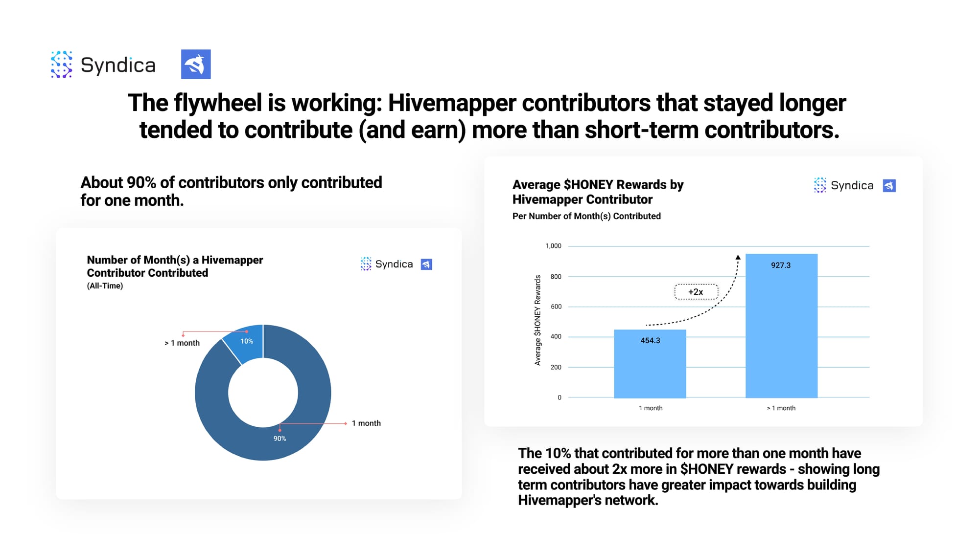 The flywheel is working: Hivemapper contributors that stayed longer tended to contribute (and earn) more than short-term contributors.