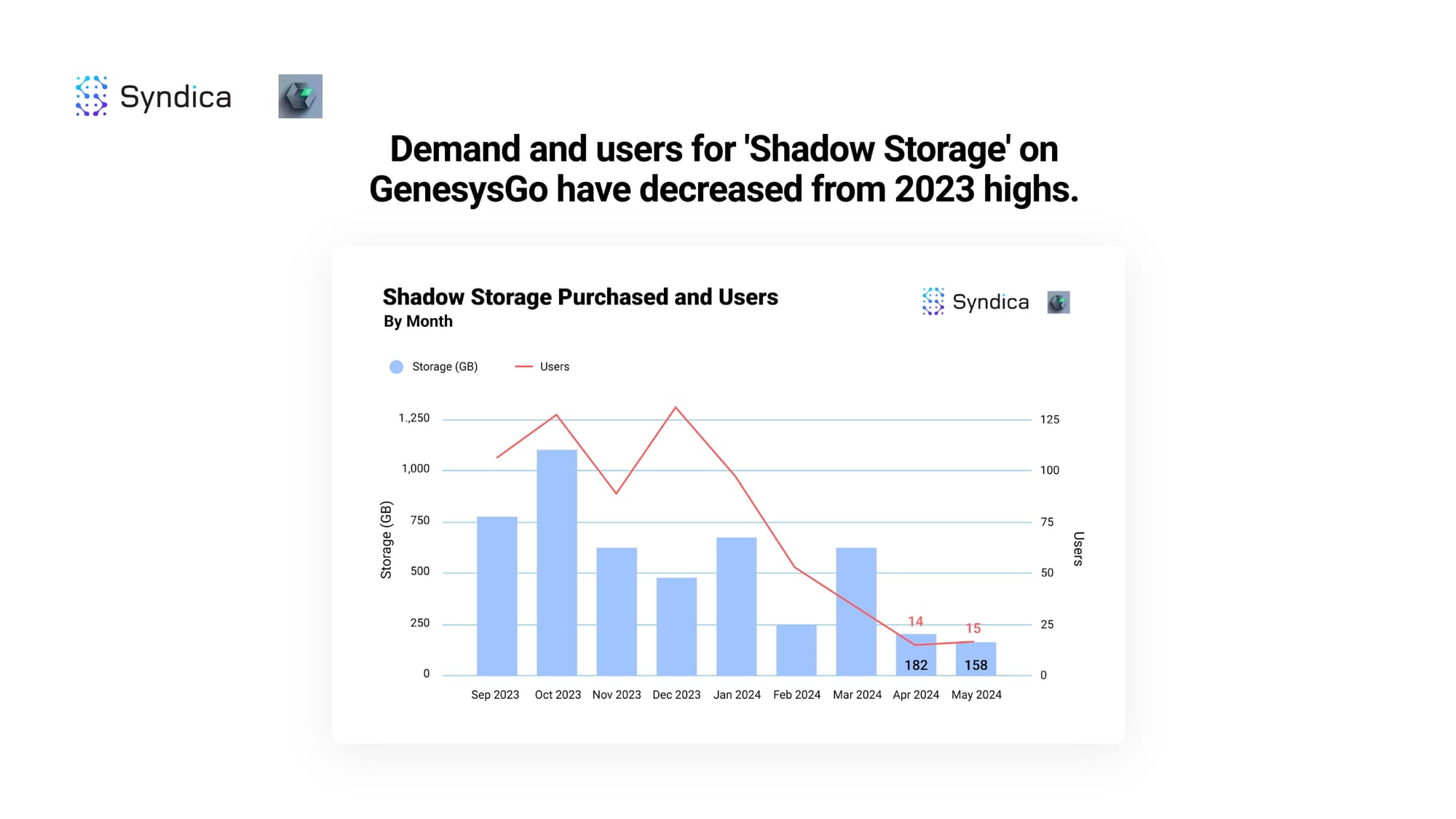 Demand and users for 'Shadow Storage' on GenesysGo have decreased from 2023 highs.