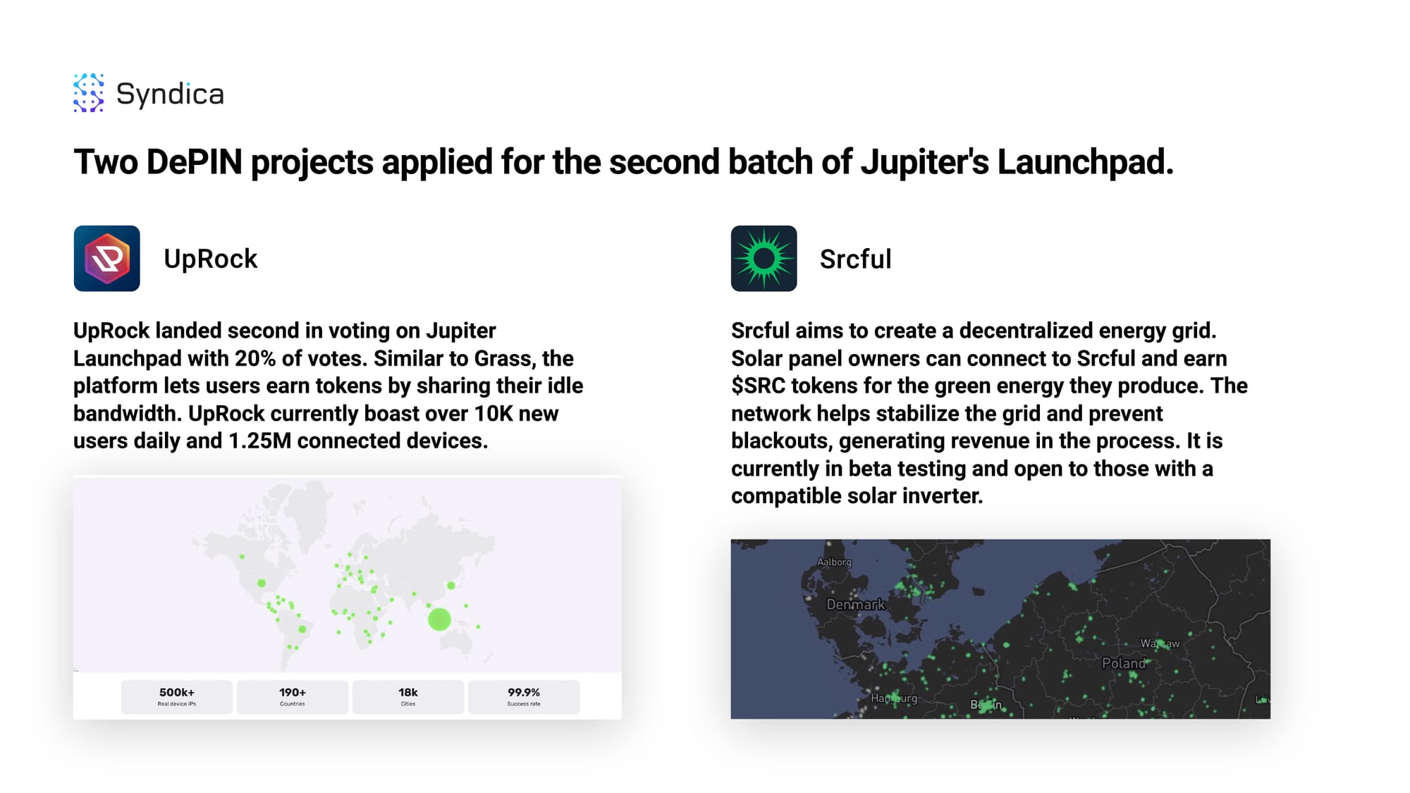 UpRock: UpRock landed second in voting on Jupiter Launchpad with 20% of votes. Similar to Grass, the platform lets users earn tokens by sharing their idle bandwidth. UpRock currently boast over 10K new users daily and 1.25M connected devices.