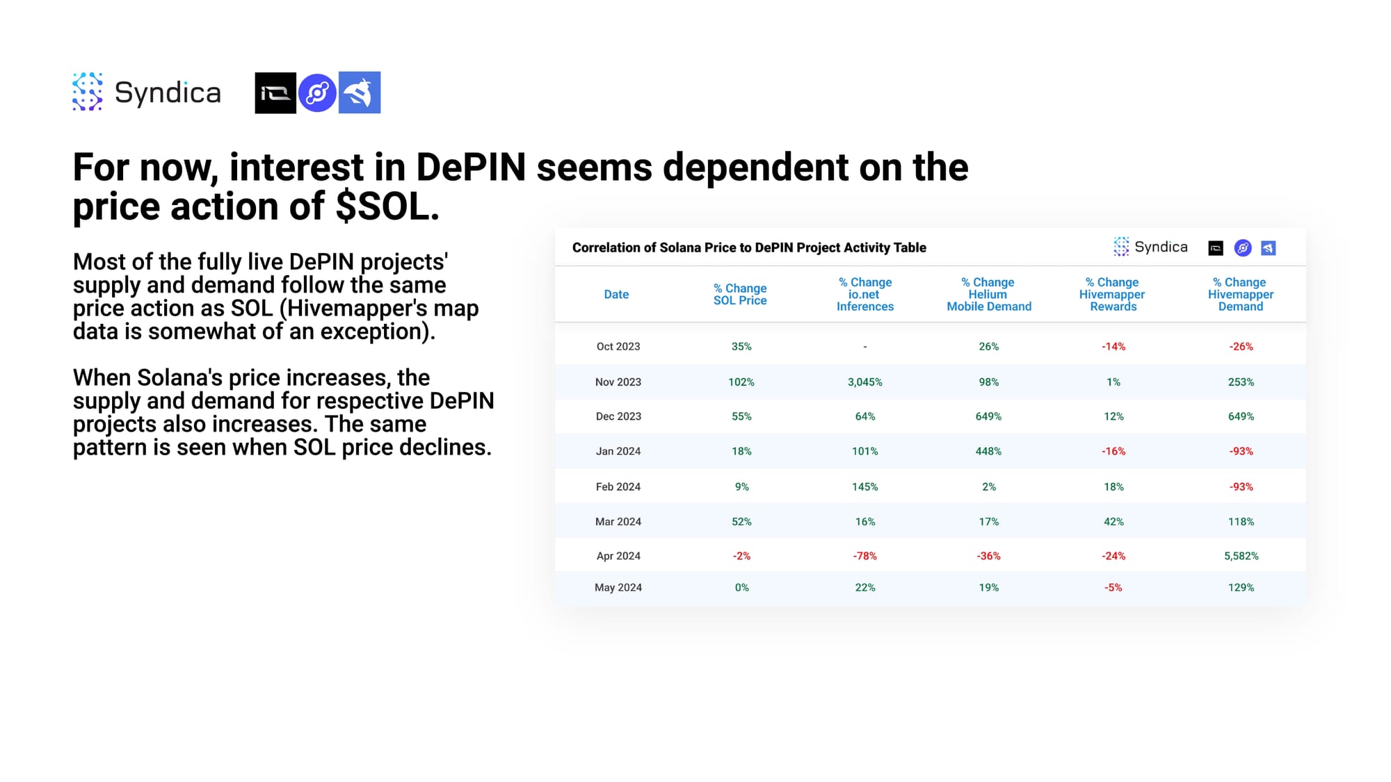 For now, interest in DePIN seems dependent on the price action of $SOL. Most of the fully live DePIN projects' supply and demand follow the same price action as SOL (Hivemapper's map data is somewhat of an exception).