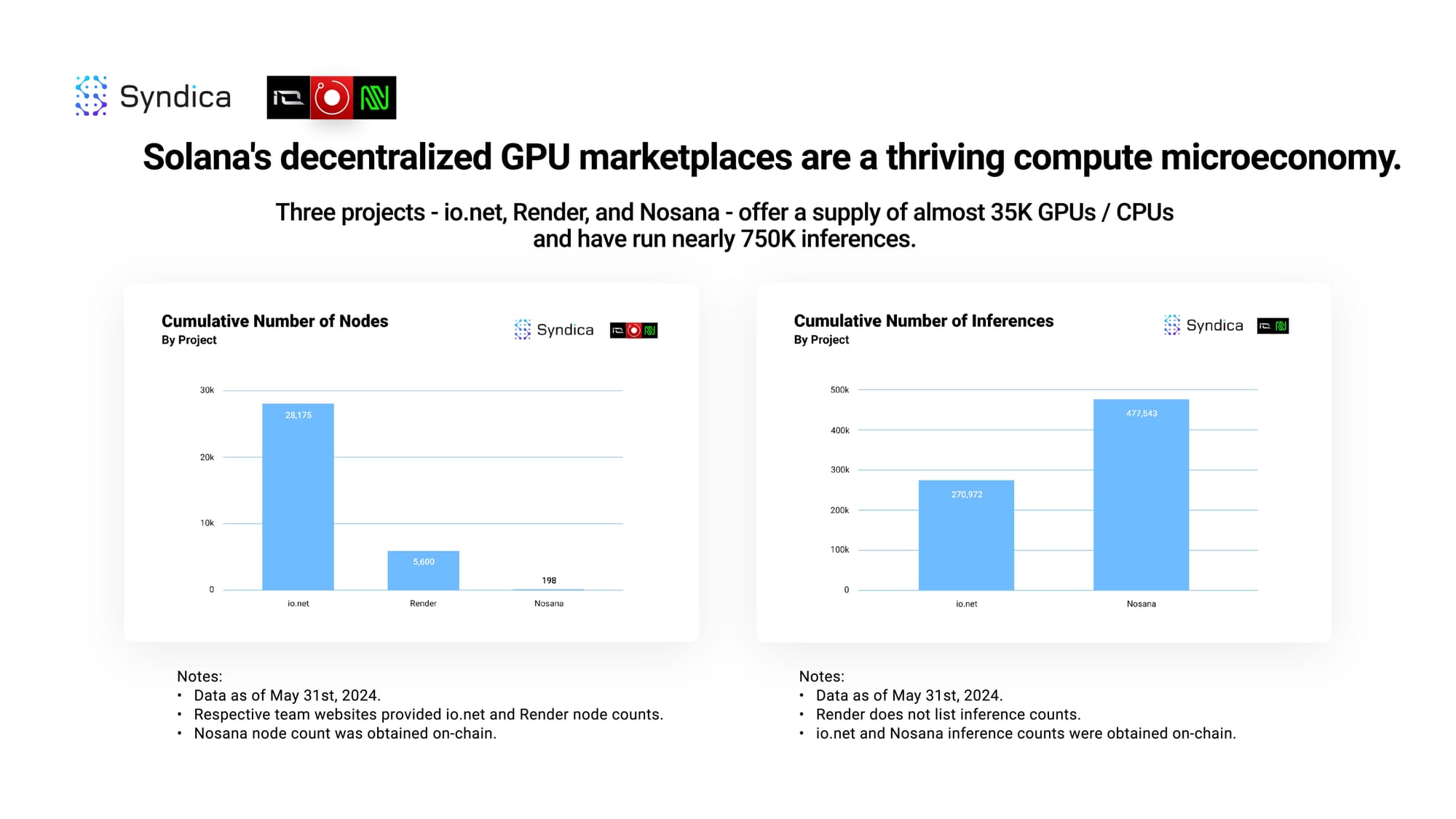 Solana's decentralized GPU marketplaces are a thriving compute microeconomy. Three projects - io.net, Render, and Nosana - offer a supply of almost 35K GPUs / CPUs and have run nearly 750K inferences.