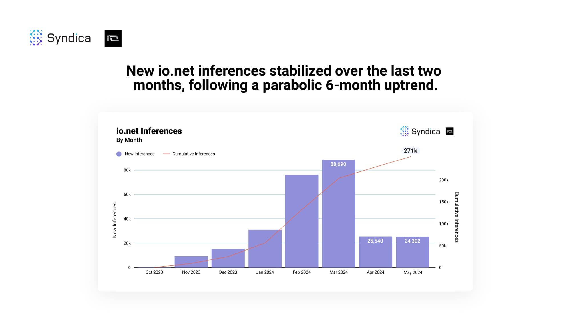 New io.net inferences stabilized over the last two months, following a parabolic 6-month uptrend.