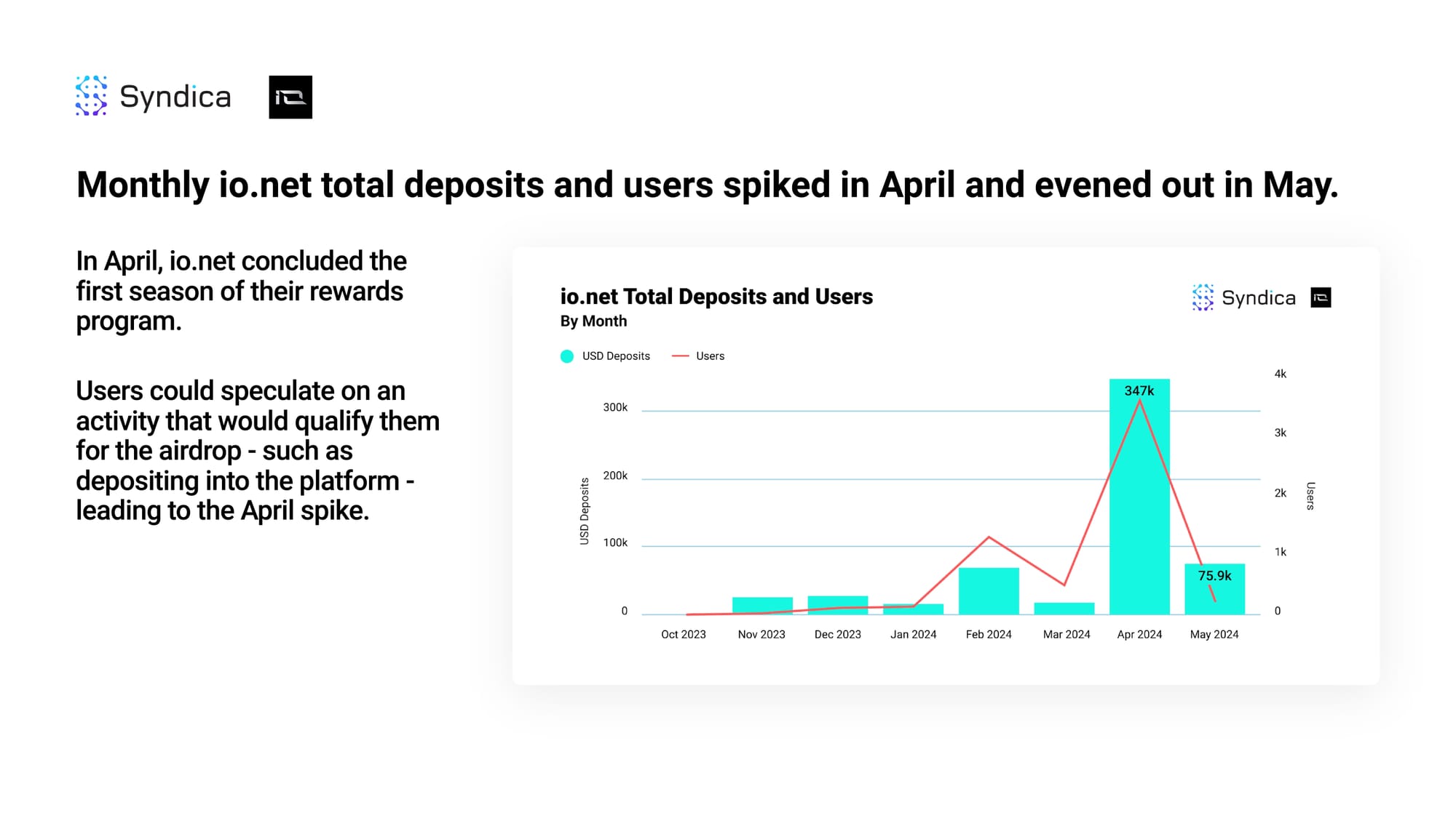 Monthly io.net total deposits and users spiked in April and evened out in May. In April, io.net concluded the first season of their rewards program. Users could speculate on an activity that would qualify them for the airdrop - such as depositing into the platform - leading to the April spike.