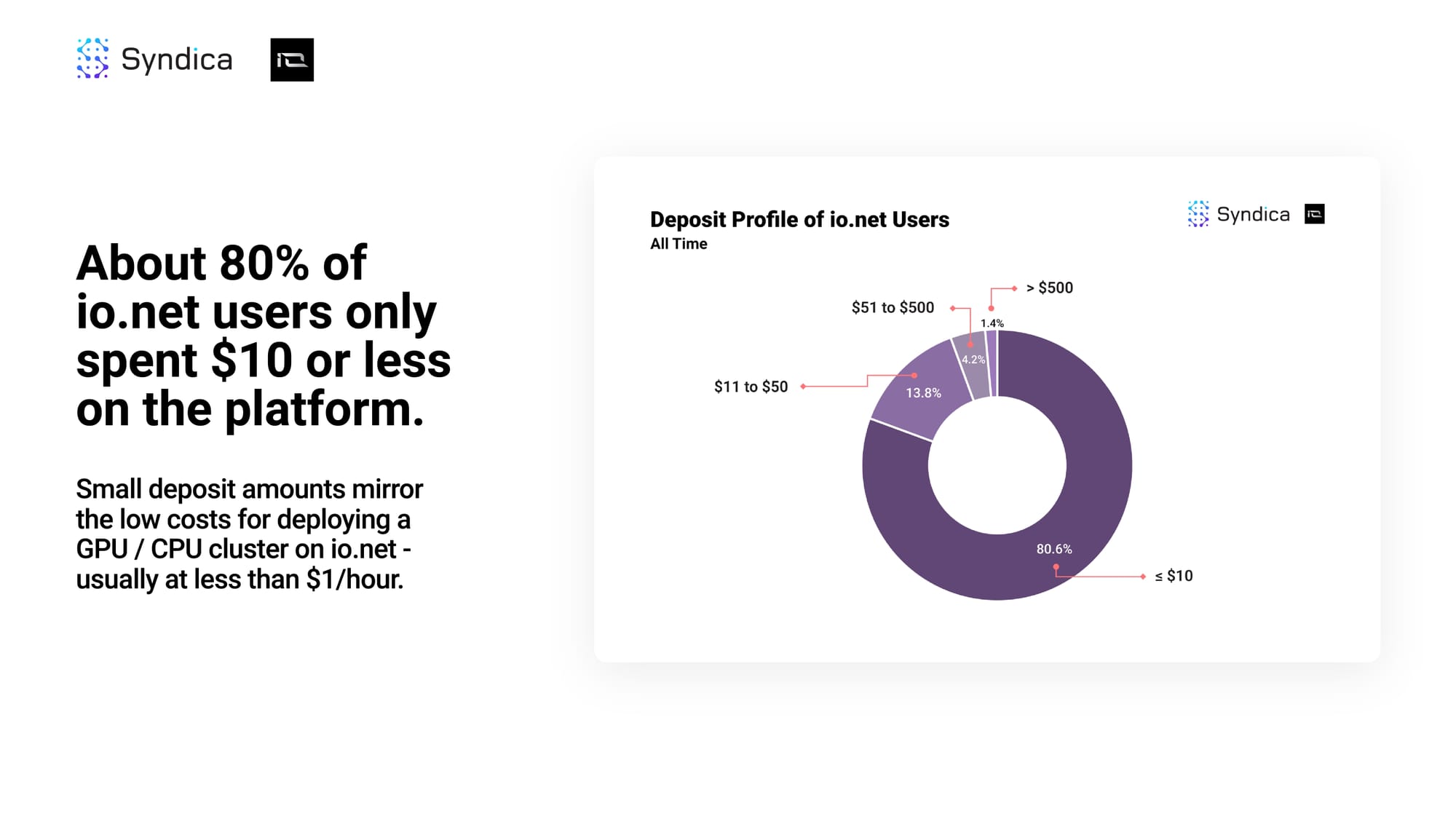 About 80% of io.net users only spent $10 or less on the platform. Small deposit amounts mirror the low costs for deploying a GPU / CPU cluster on io.net - usually at less than $1/hour.