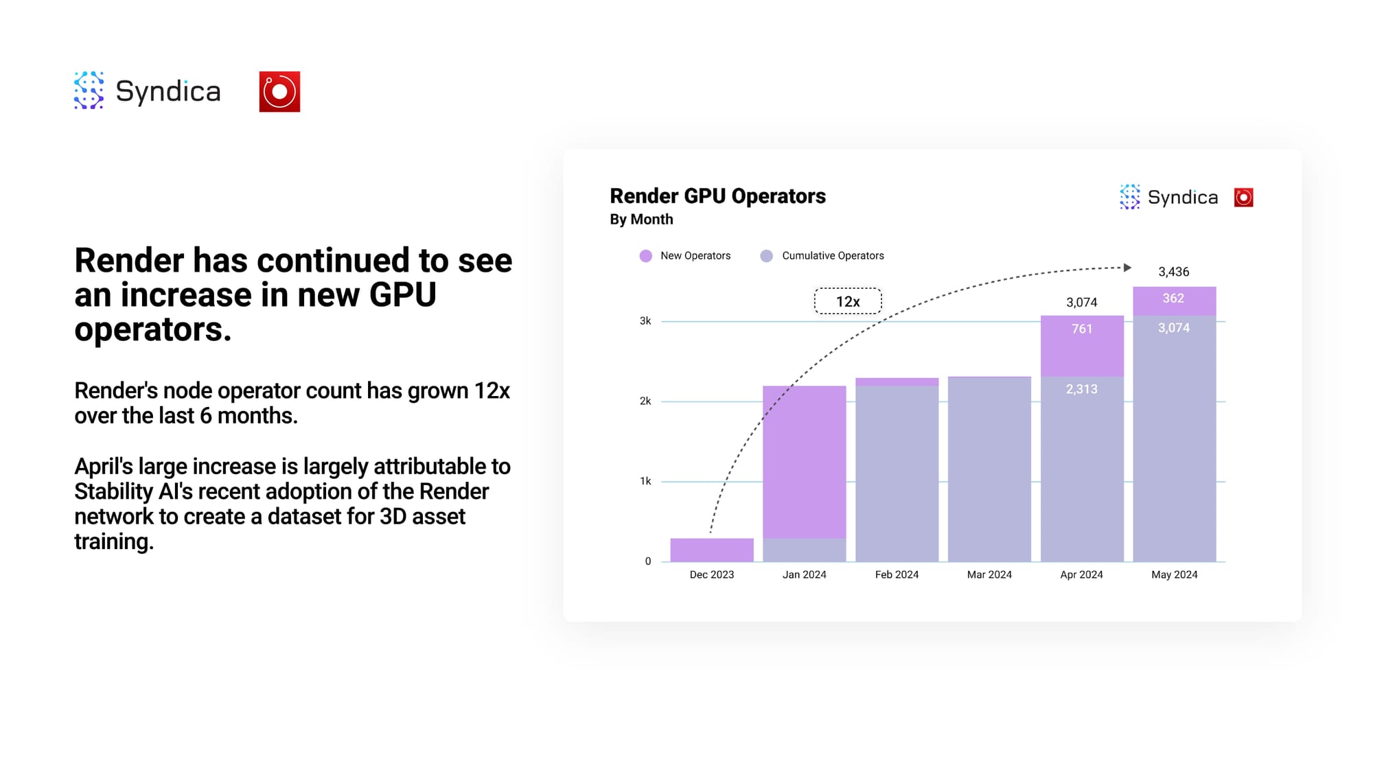 Render has continued to see an increase in new GPU operators. Render's node operator count has grown 12x over the last 6 months.