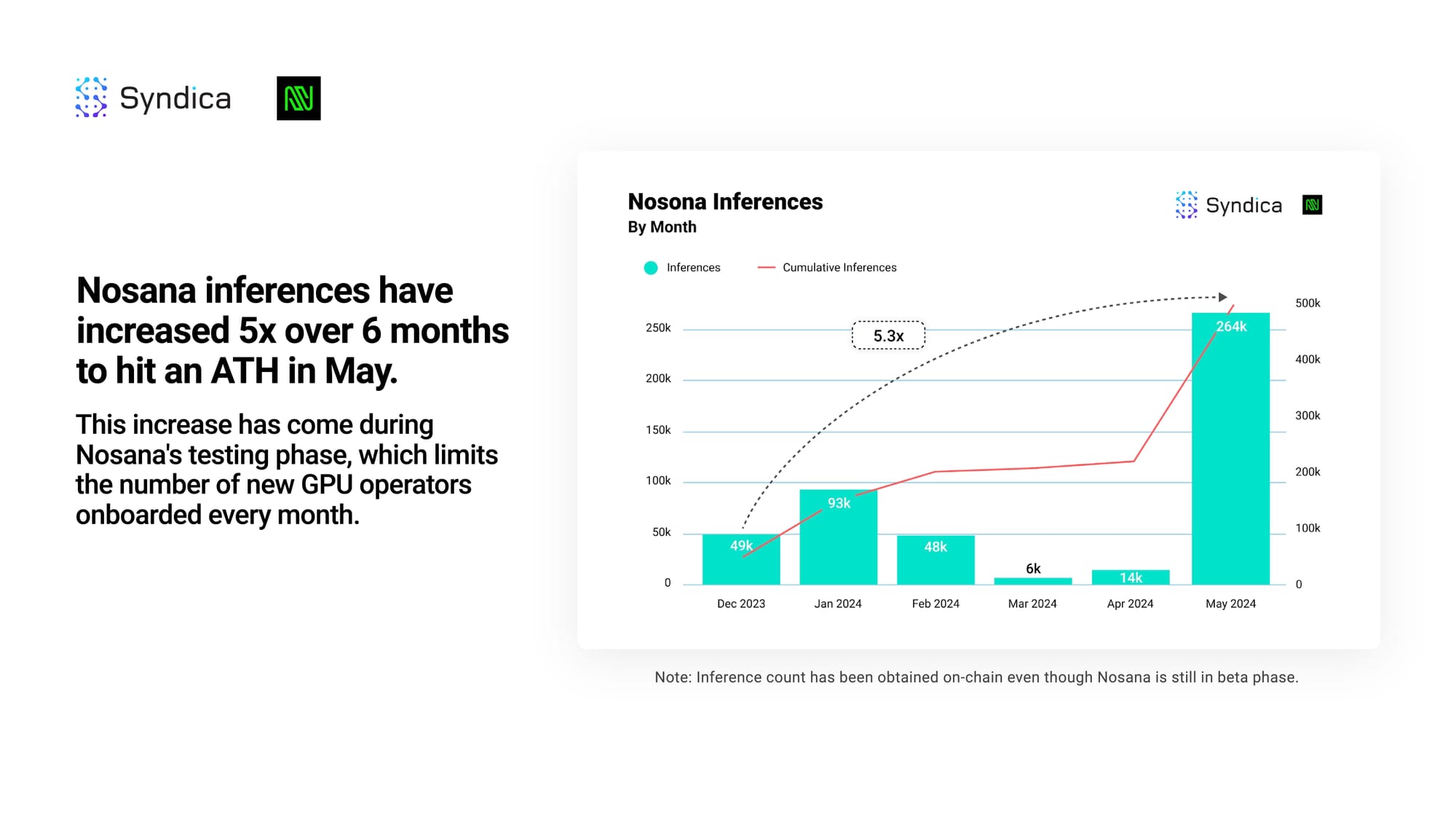 Nosana inferences have increased 5x over 6 months to hit an ATH in May. This increase has come during Nosana's testing phase, which limits the number of new GPU operators onboarded every month.