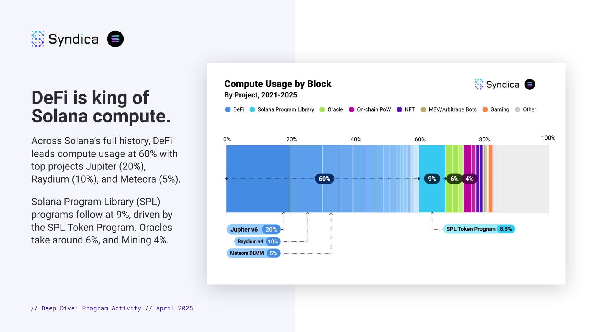DeFi is king of Solana compute. Across Solana’s full history, DeFi leads compute usage at 60% with top projects Jupiter (20%), Raydium (10%), and Meteora (5%). Solana Program Library (SPL) programs follow at 9%, driven by the SPL Token Program. Oracles take around 6%, and Mining 4%.