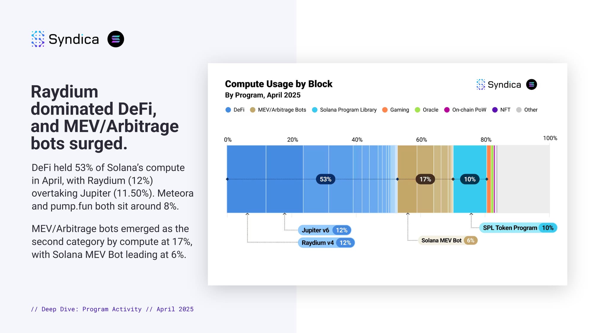 Raydium dominated DeFi, and MEV/Arbitrage bots surged. DeFi held 53% of Solana’s compute in April, with Raydium (12%) overtaking Jupiter (11.50%). Meteora and pump.fun both sit around 8%. MEV/Arbitrage bots emerged as the second category by compute at 17%, with Solana MEV Bot leading at 6%.