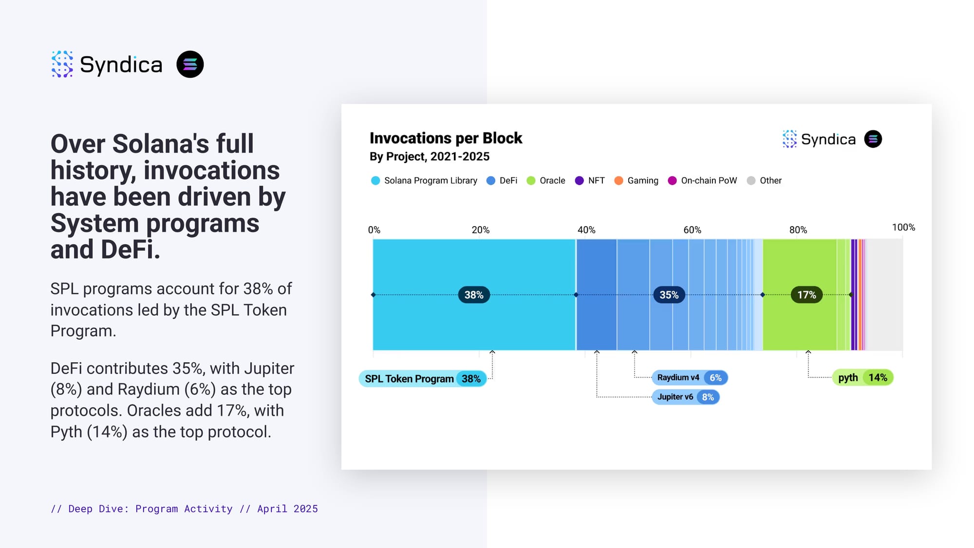 Over Solana's full history, invocations have been driven by System programs and DeFi. SPL programs account for 38% of invocations led by the SPL Token Program. DeFi contributes 35%, with Jupiter (8%) and Raydium (6%) as the top protocols. Oracles add 17%, with Pyth (14%) as the top protocol.