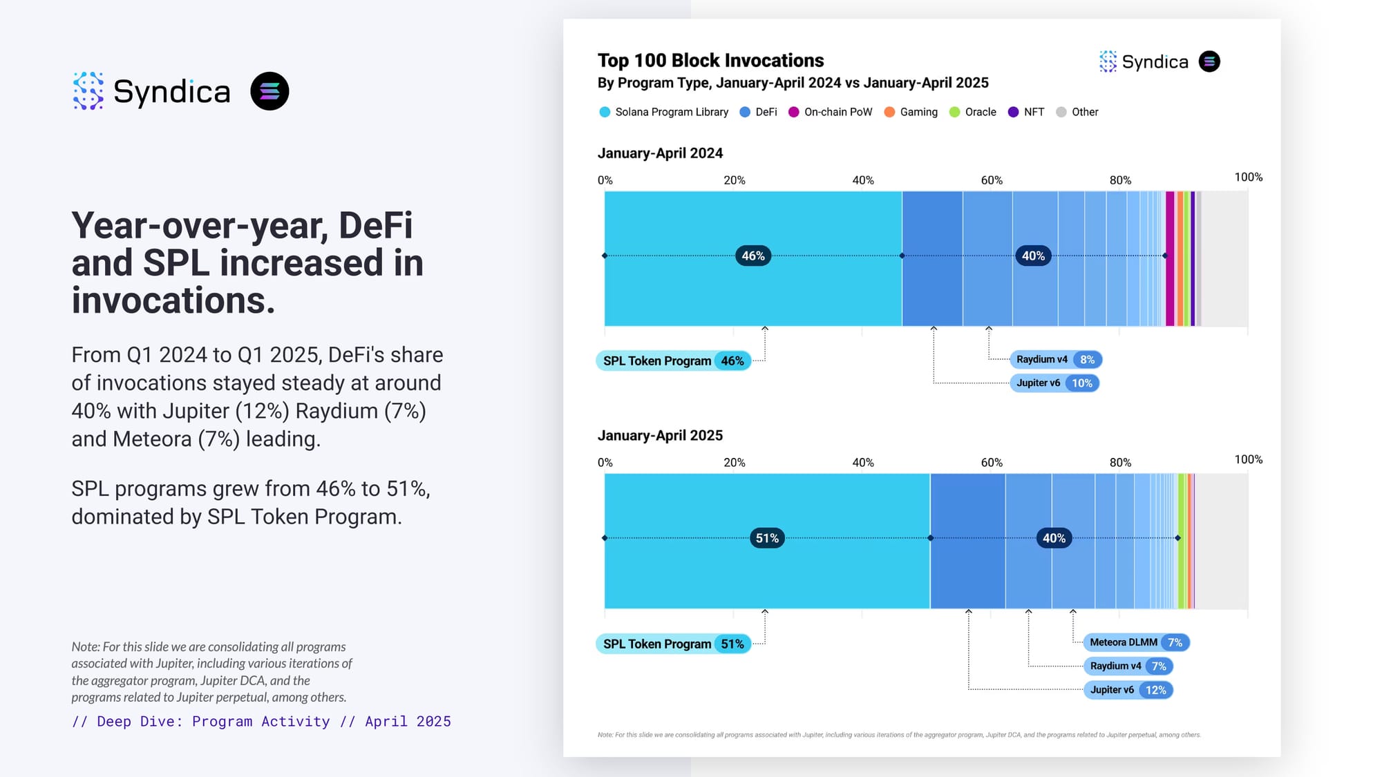 Year-over-year, DeFi and SPL increased in invocations. From Q1 2024 to Q1 2025, DeFi's share of invocations stayed steady at around 40% with Jupiter (12%) Raydium (7%) and Meteora (7%) leading. SPL programs grew from 46% to 51%, dominated by SPL Token Program.