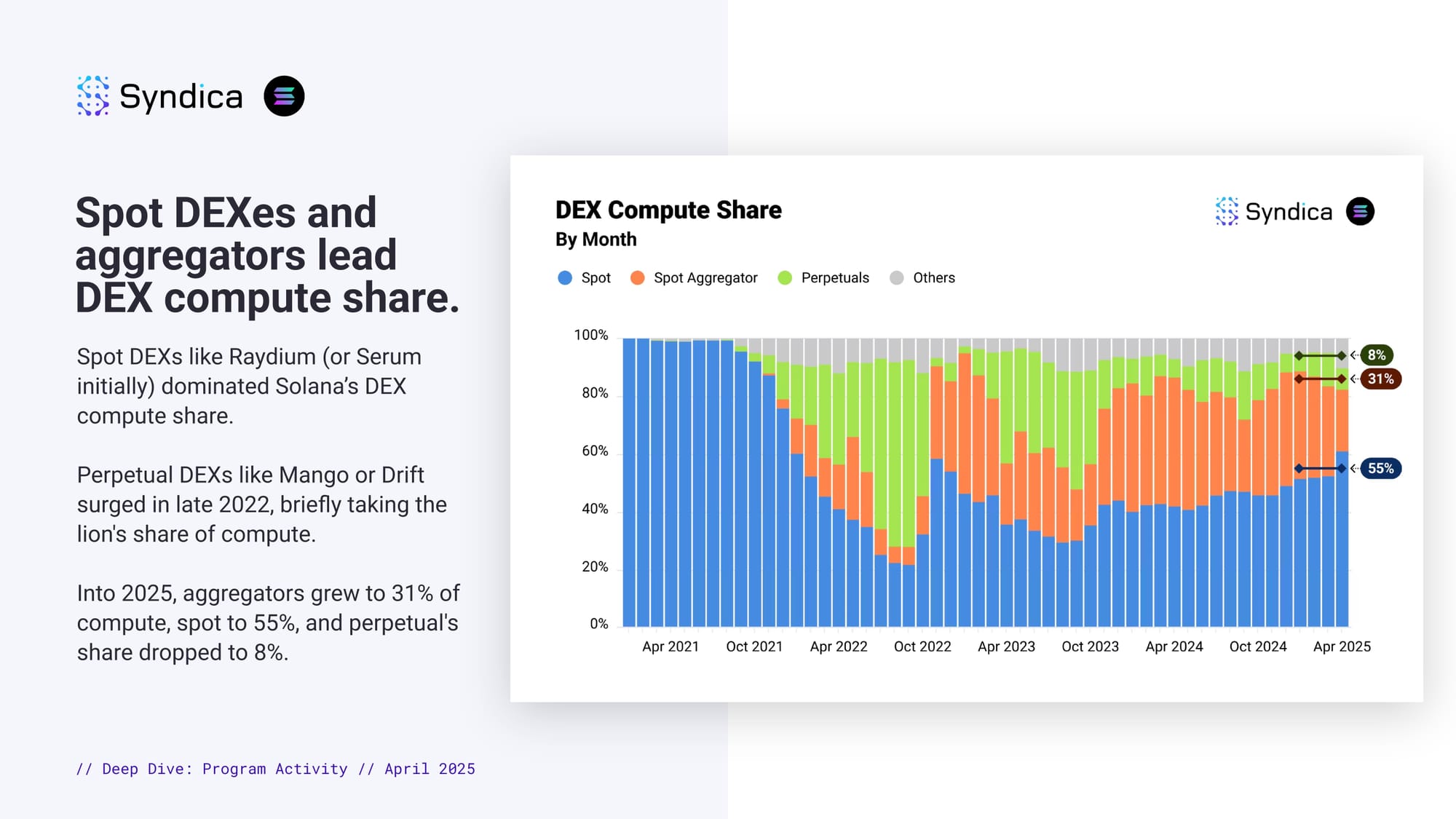 Spot DEXes and aggregators lead DEX compute share. Spot DEXs like Raydium (or Serum initially) dominated Solana’s DEX compute share. Perpetual DEXs like Mango or Drift surged in late 2022, briefly taking the lion's share of compute. Into 2025, aggregators grew to 31% of compute, spot to 55%, and perpetual's share dropped to 8%.