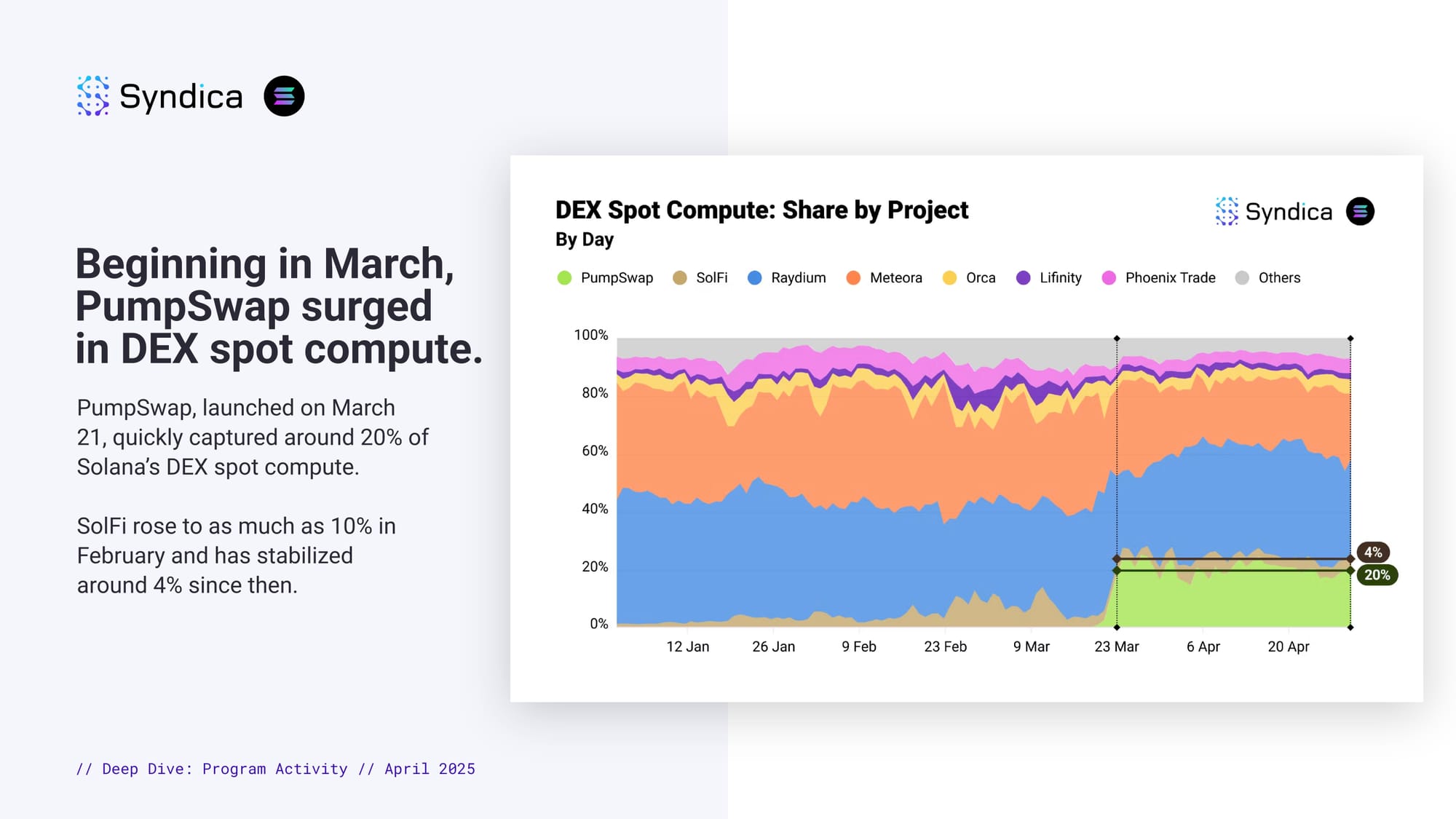 Beginning in March, PumpSwap surged in DEX spot compute. PumpSwap, launched on March 21, quickly captured around 20% of Solana’s DEX spot compute. SolFi rose to as much as 10% in February and has stabilized around 4% since then.