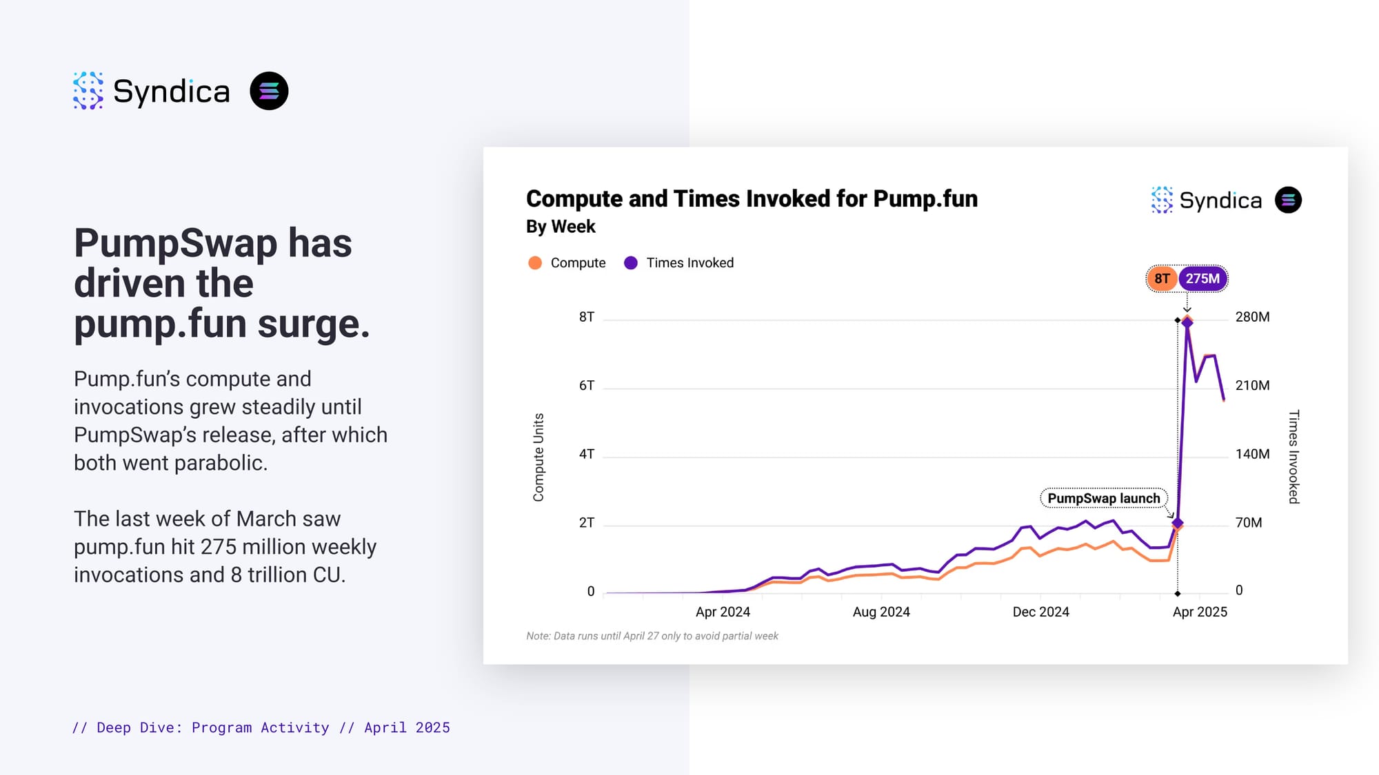 PumpSwap has driven the pump.fun surge. Pump.fun’s compute and invocations grew steadily until PumpSwap’s release, after which both went parabolic. The last week of March saw pump.fun hit 275 million weekly invocations and 8 trillion CU.
