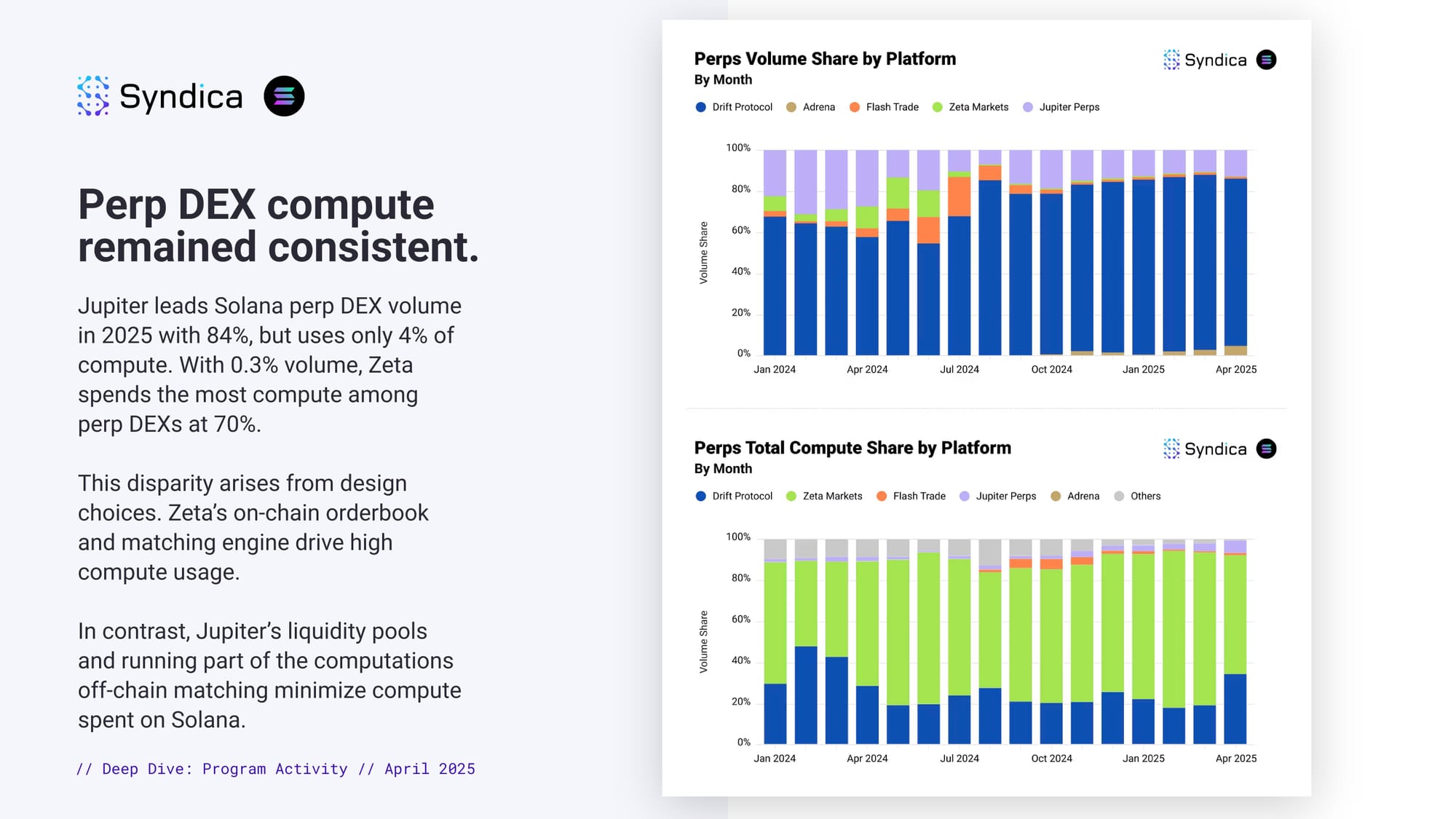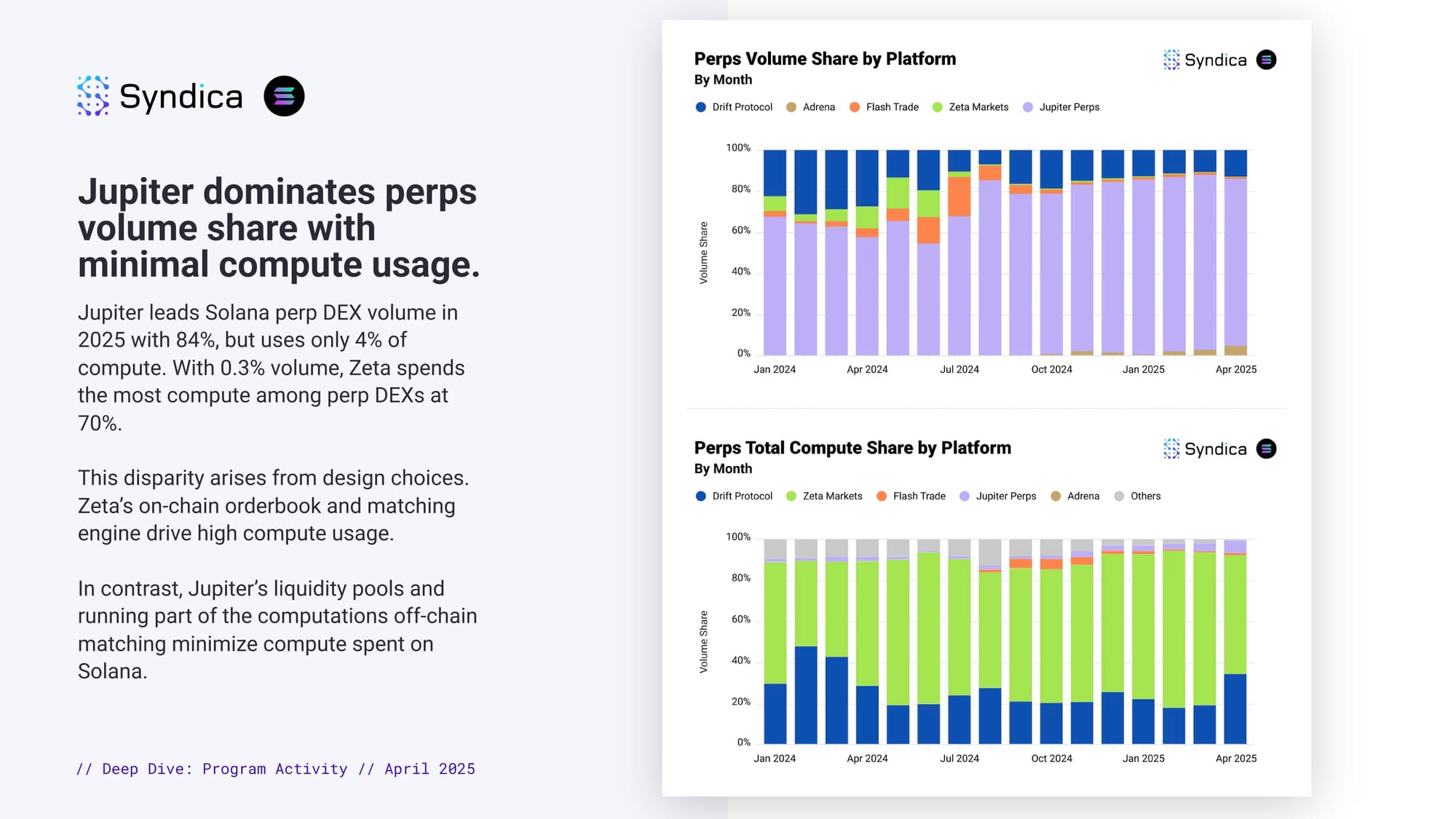 Jupiter dominates perps volume share with minimal compute usage. Jupiter leads Solana perp DEX volume in 2025 with 84%, but uses only 4% of compute. With 0.3% volume, Zeta spends the most compute among perp DEXs at 70%. This disparity arises from design choices. Zeta’s on-chain orderbook and matching engine drive high compute usage. In contrast, Jupiter’s liquidity pools and running part of the computations off-chain matching minimize compute spent on Solana.