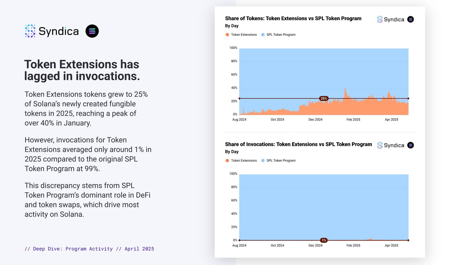Token Extensions has lagged in invocations. Token Extensions tokens grew to 25% of Solana’s newly created fungible tokens in 2025, reaching a peak of over 40% in January. However, invocations for Token Extensions averaged only around 1% in 2025 compared to the original SPL at 99%. This discrepancy stems from SPL tokens’ dominant role in DeFi and token swaps, which drive most activity on Solana.