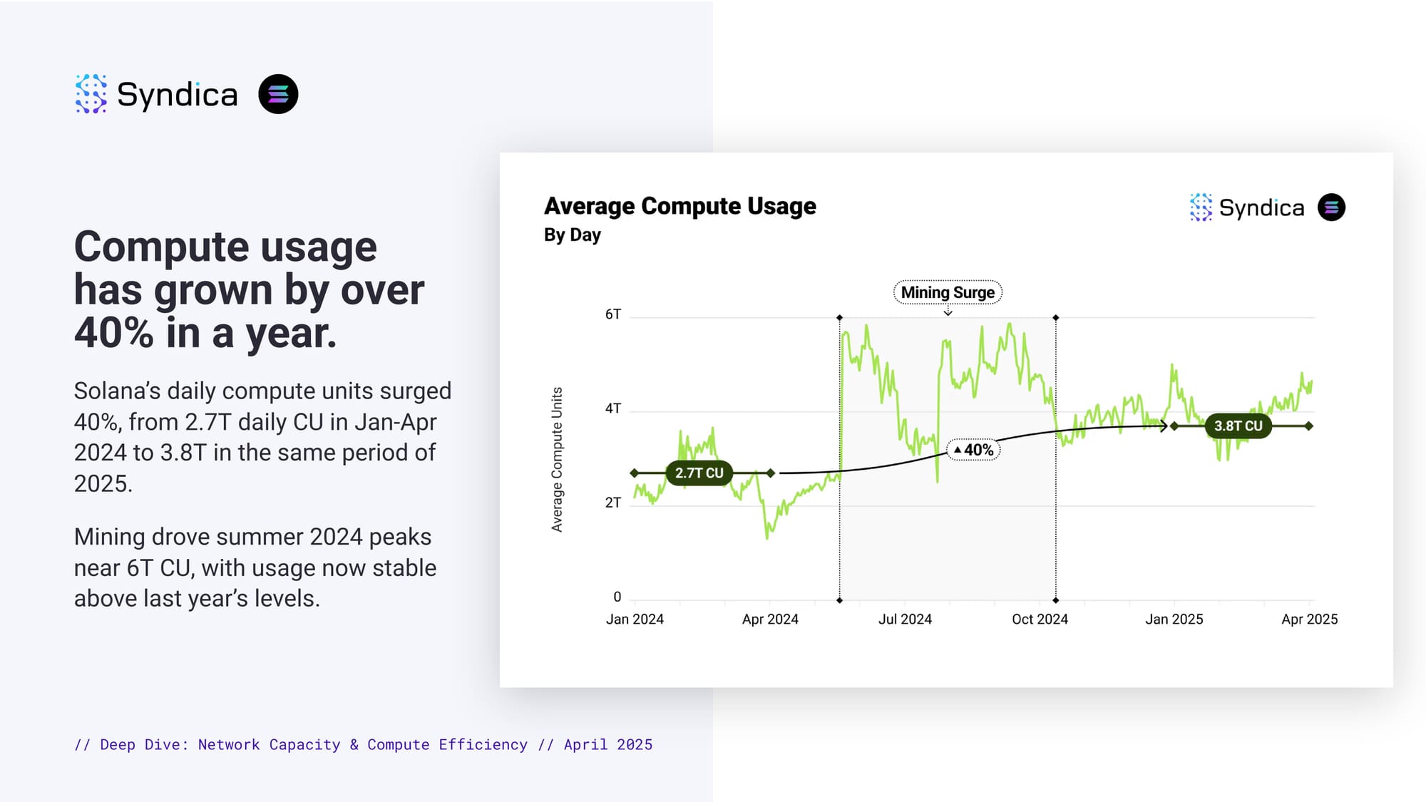 Compute usage has grown by over 40% in a year. Solana’s daily compute units surged 40%, from 2.7T daily CU in Jan-Apr 2024 to 3.8T in the same period of 2025. Mining drove summer 2024 peaks near 6T CU, with usage now stable above last year’s levels.