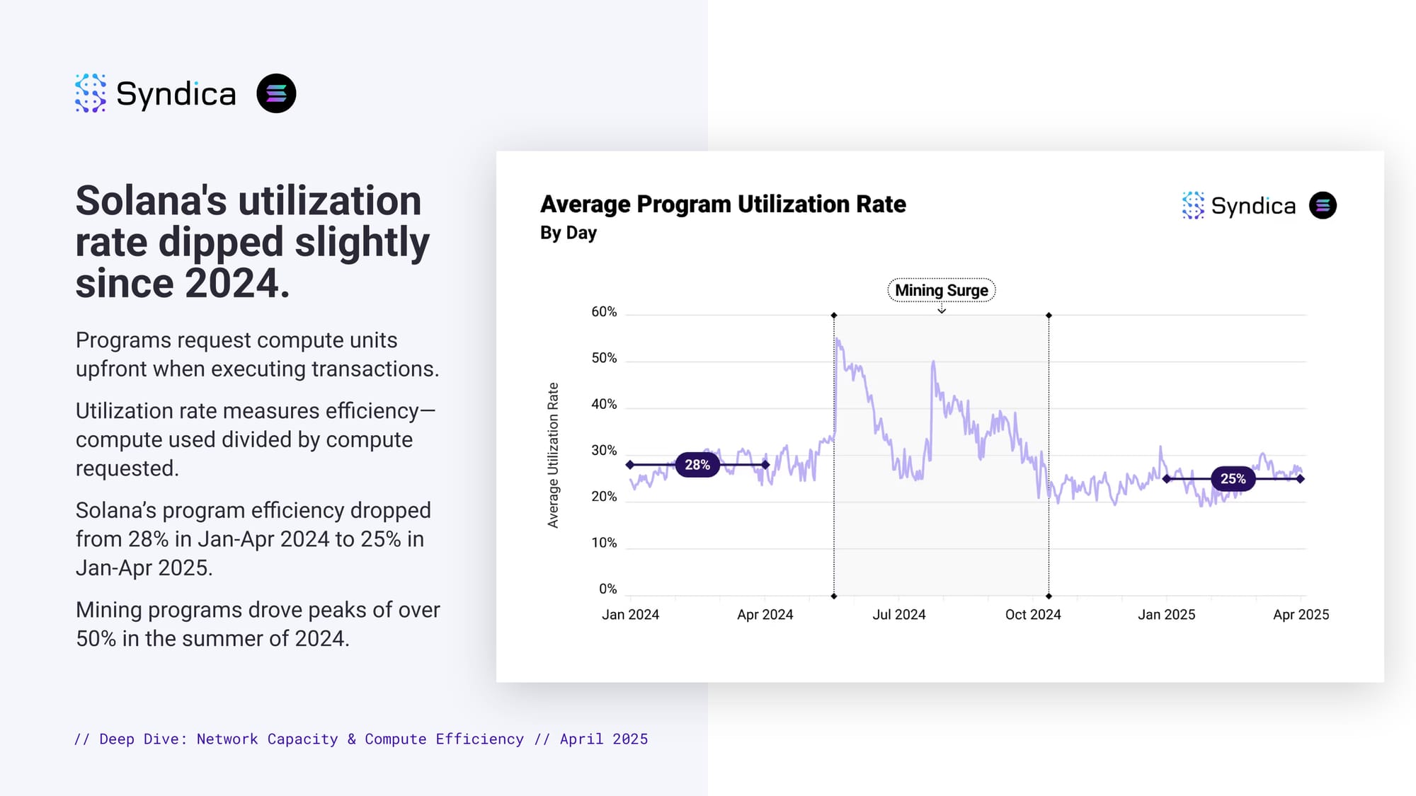 Solana's utilization rate dipped slightly since 2024. Programs request compute units upfront when executing transactions. Utilization rate measures efficiency—compute used divided by compute requested. Solana’s program efficiency dropped from 28% in Jan-Apr 2024 to 25% in Jan-Apr 2025. Mining programs drove peaks of over 50% in the summer of 2024.