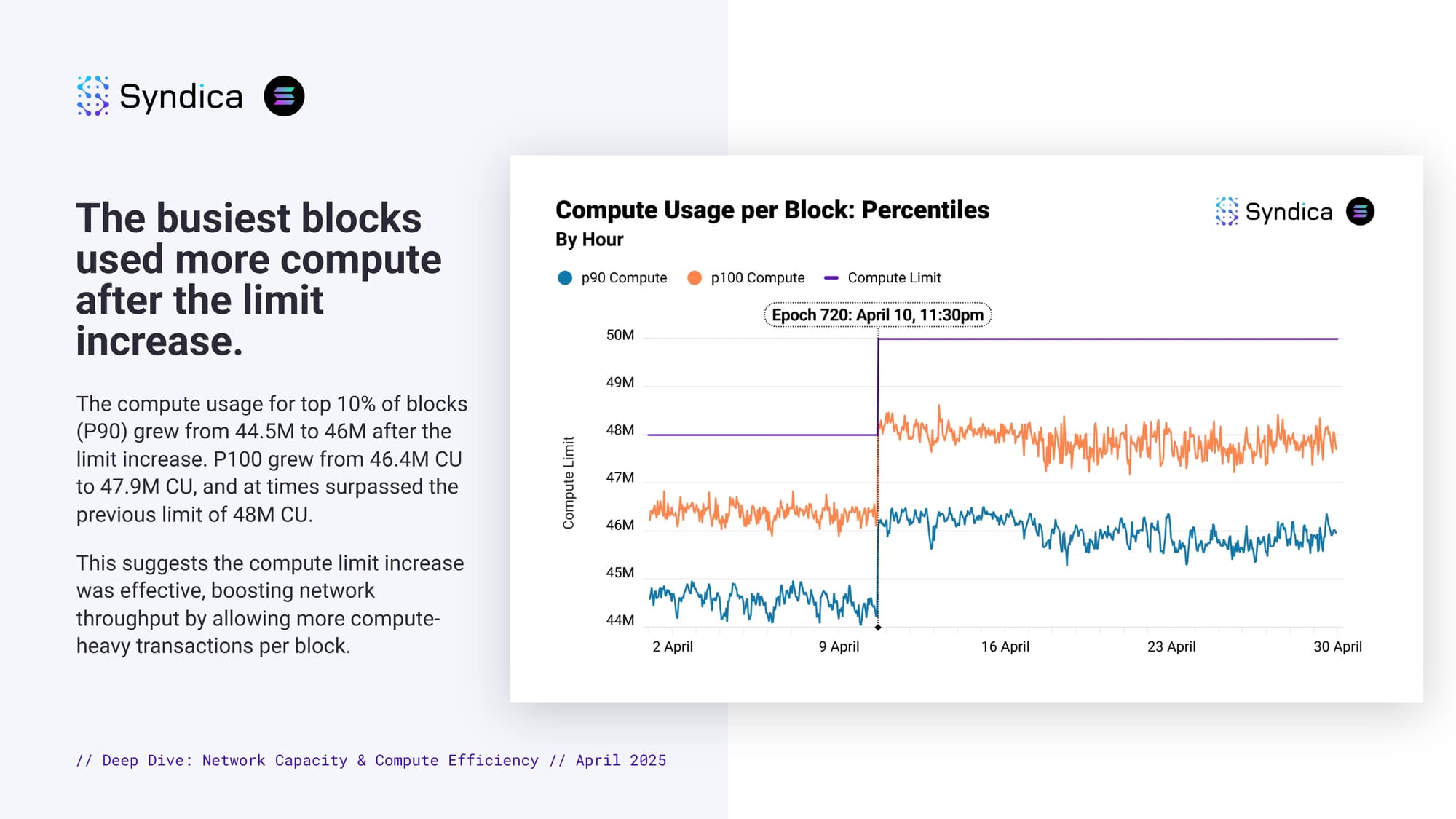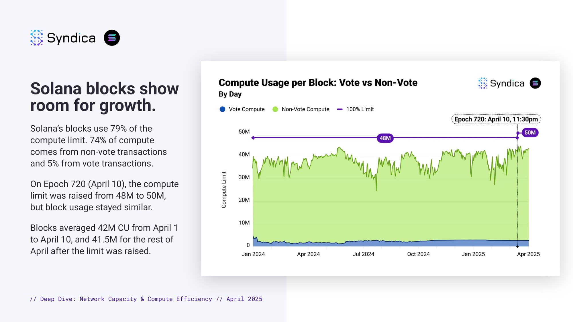 Solana blocks show room for growth. Solana’s blocks use 79% of the compute limit. 74% of compute comes from non-vote transactions and 5% from vote transactions. On Epoch 720 (April 10), the compute limit was raised from 48M to 50M, but block usage stayed similar. Blocks averaged 42M CU from April 1 to April 10, and 41.5M for the rest of April after the limit was raised.