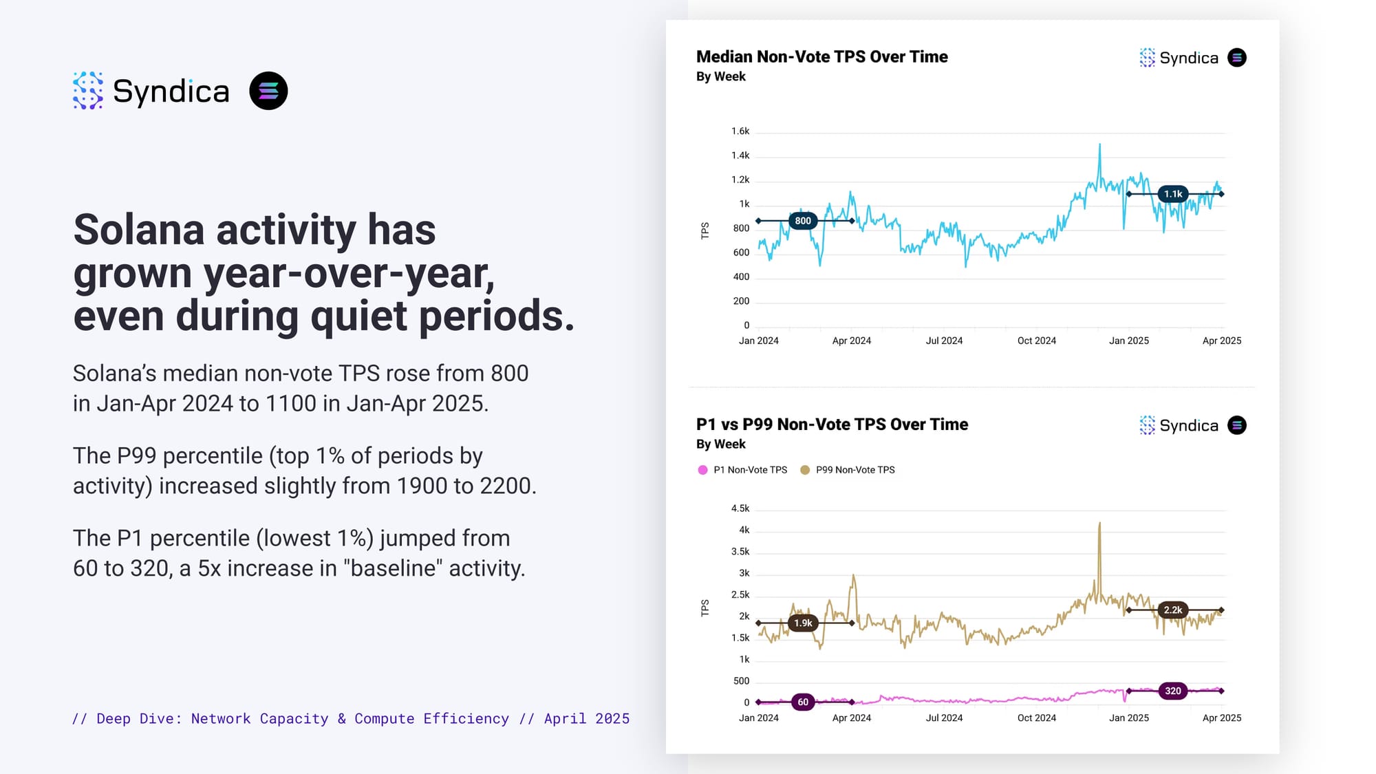 Solana activity has grown year-over-year, even during quiet periods. Solana’s median non-vote TPS rose from 800 in Jan-Apr 2024 to 1100 in Jan-Apr 2025. The P99 percentile (top 1% of periods by activity) increased slightly from 1900 to 2200. The P1 percentile (lowest 1%) jumped from 60 to 320, a 5x increase in "baseline" activity.