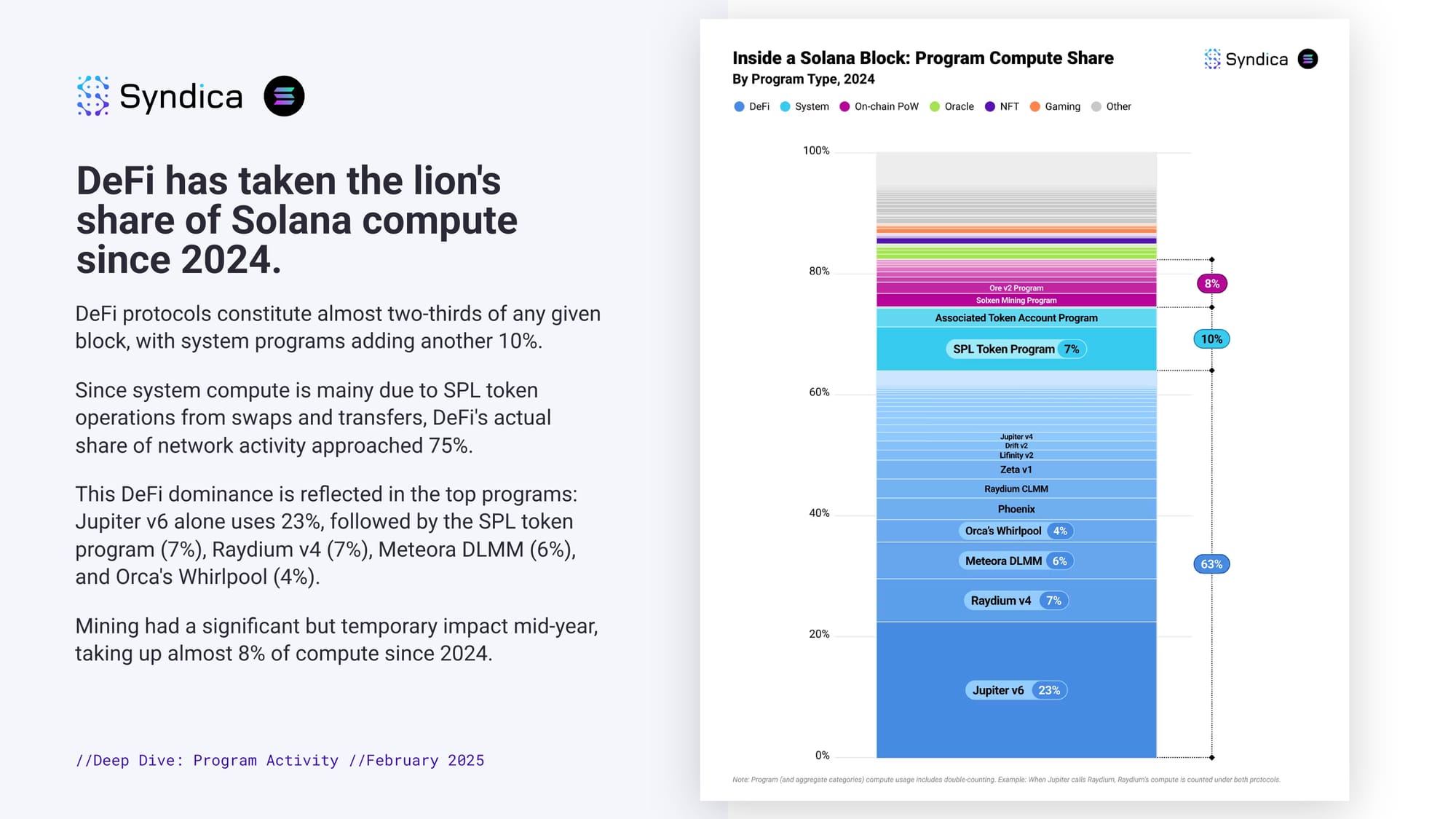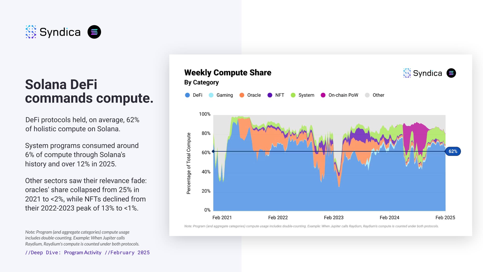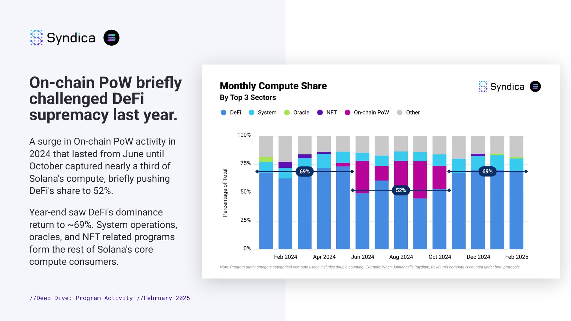 On-chain PoW briefly challenged DeFi supremacy last year. A surge in On-chain PoW activity in 2024 that lasted from June until October captured nearly a third of Solana's compute, briefly pushing DeFi's share to 52%. Year-end saw DeFi's dominance return to ~69%. System operations, oracles, and NFT related programs form the rest of Solana's core compute consumers.