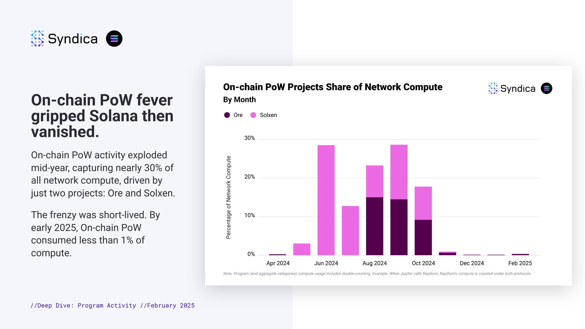 On-chain PoW fever gripped Solana then vanished. On-chain PoW activity exploded mid-year, capturing nearly 30% of all network compute, driven by just two projects: Ore and Solxen. The frenzy was short-lived. By early 2025, On-chain PoW consumed less than 1% of compute.