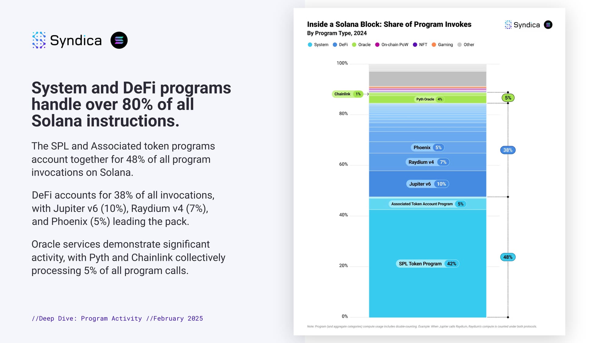 System and DeFi programs handle over 80% of all Solana instructions. The SPL and Associated token programs account together for 48% of all program invocations on Solana. DeFi accounts for 38% of all invocations, with Jupiter v6 (10%), Raydium v4 (7%), and Phoenix (5%) leading the pack. Oracle services demonstrate significant activity, with Pyth and Chainlink collectively processing 5% of all program calls.