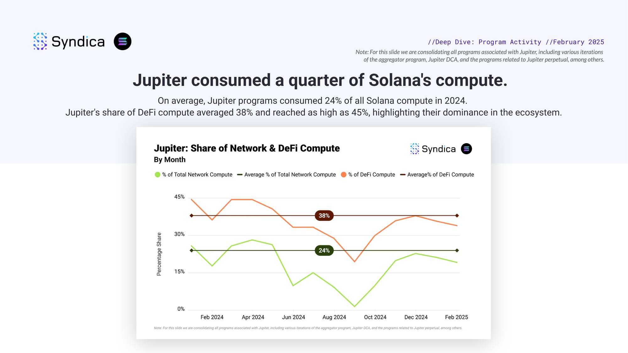 Jupiter consumed a quarter of Solana's compute. On average, Jupiter programs consumed 24% of all Solana compute in 2024. Jupiter's share of DeFi compute averaged 38% and reached as high as 45%, highlighting their dominance in the ecosystem.