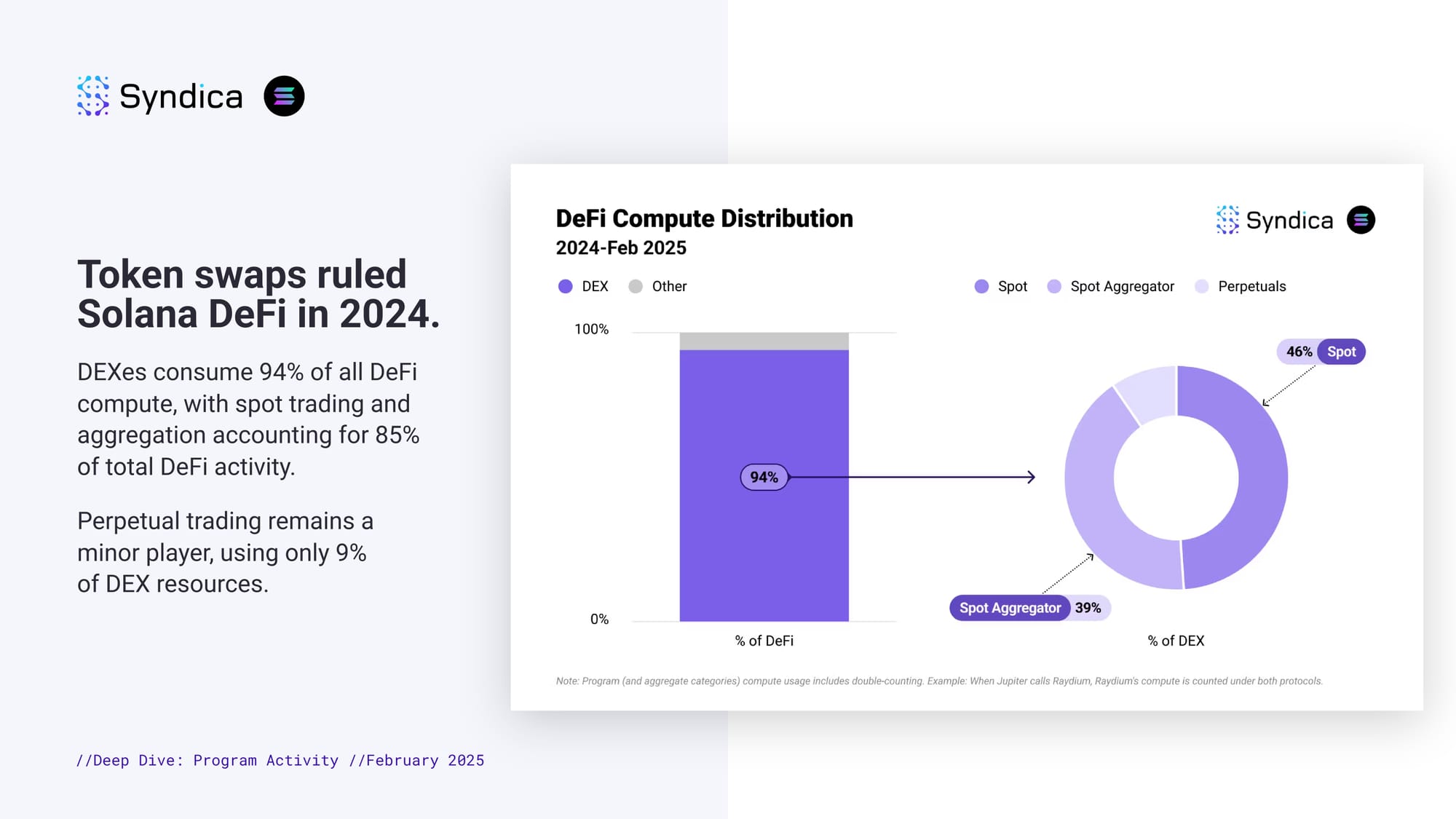 Token swaps ruled Solana DeFi in 2024. DEXes consume 94% of all DeFi compute, with spot trading and aggregation accounting for 85% of total DeFi activity. Perpetual trading remains a minor player, using only 9% of DEX resources.