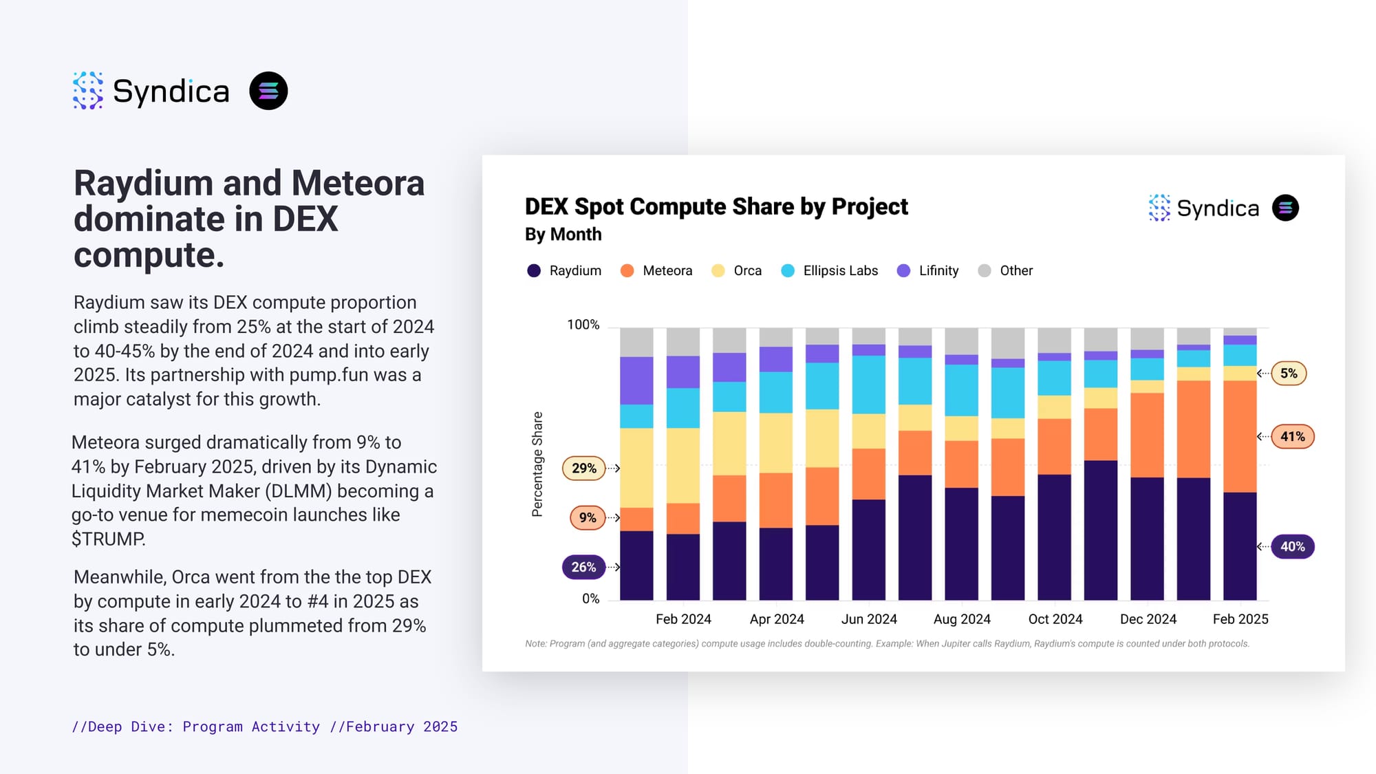 Raydium and Meteora dominate in DEX compute. Raydium saw its DEX compute proportion climb steadily from 25% at the start of 2024 to 40-45% by the end of 2024 and into early 2025. Its partnership with pump.fun was a major catalyst for this growth. Meteora surged dramatically from 9% to 41% by February 2025, driven by its Dynamic Liquidity Market Maker (DLMM) becoming a go-to venue for memecoin launches like $TRUMP. Meanwhile, Orca went from the the top DEX by compute in early 2024 to #4 in 2025 as its share of compute plummeted from 29% to under 5%.