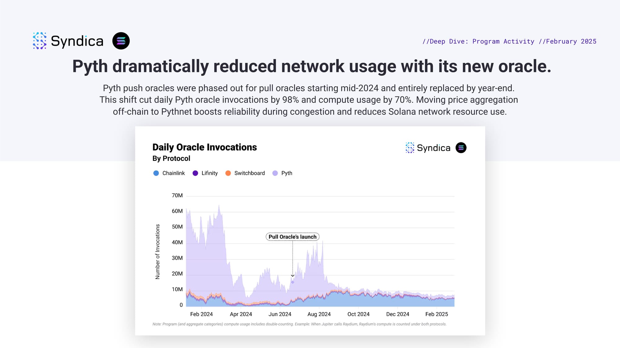 Pyth dramatically reduced network usage with its new oracle. Pyth push oracles were phased out for pull oracles starting mid-2024 and entirely replaced by year-end. This shift cut daily Pyth oracle invocations by 98% and compute usage by 70%. Moving price aggregation off-chain to Pythnet boosts reliability during congestion and reduces Solana network resource use.