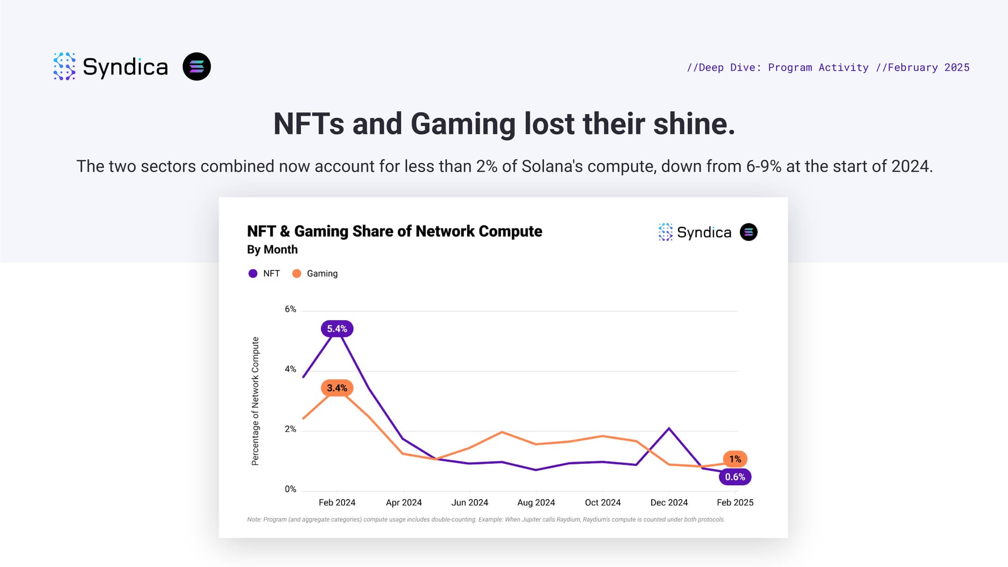 NFTs and Gaming lost their shine. The two sectors combined now account for less than 2% of Solana's compute, down from 6-9% at the start of 2024.