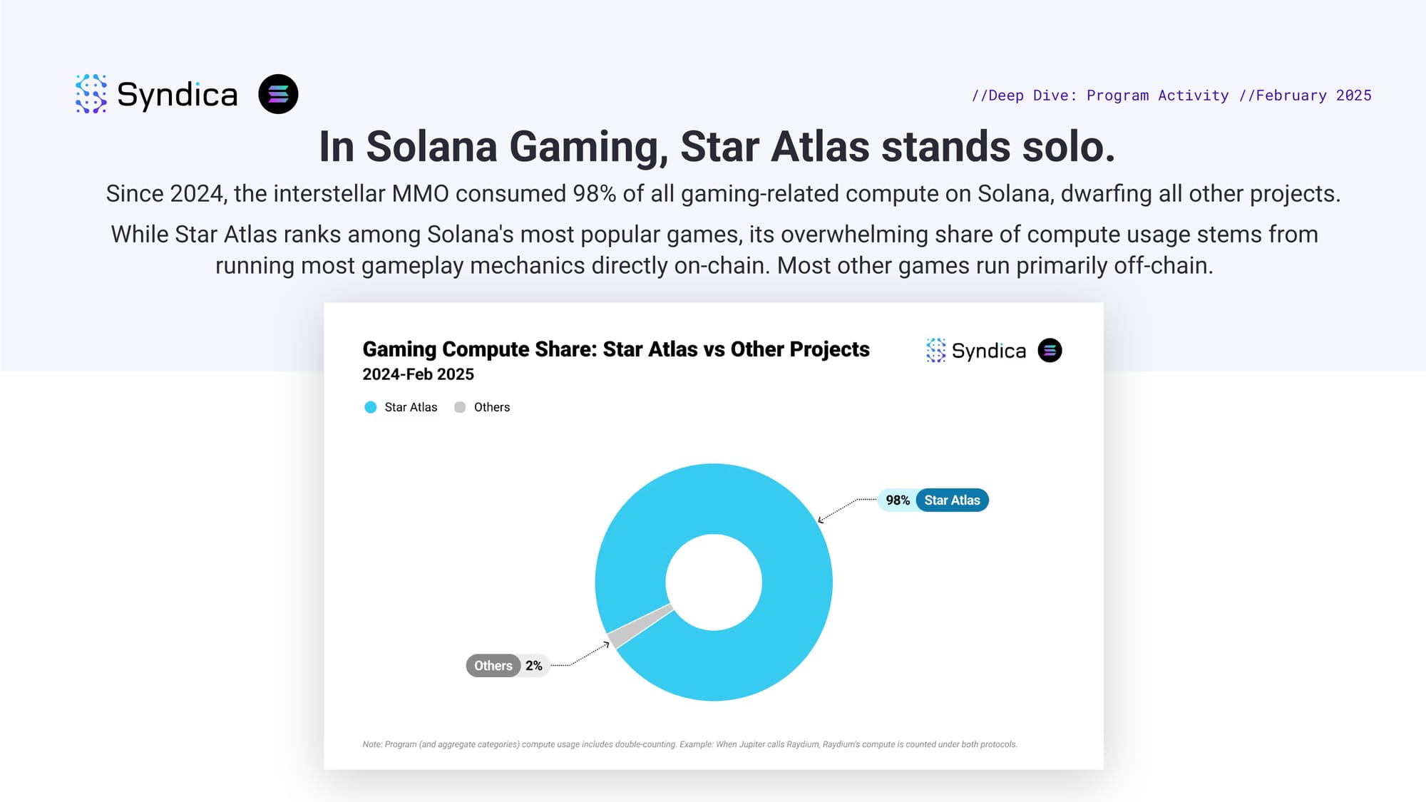 In Solana Gaming, Star Atlas stands solo. Since 2024, the interstellar MMO consumed 98% of all gaming-related compute on Solana, dwarfing all other projects. While Star Atlas ranks among Solana's most popular games, its overwhelming share of compute usage stems from running most gameplay mechanics directly on-chain. Most other games run primarily off-chain.