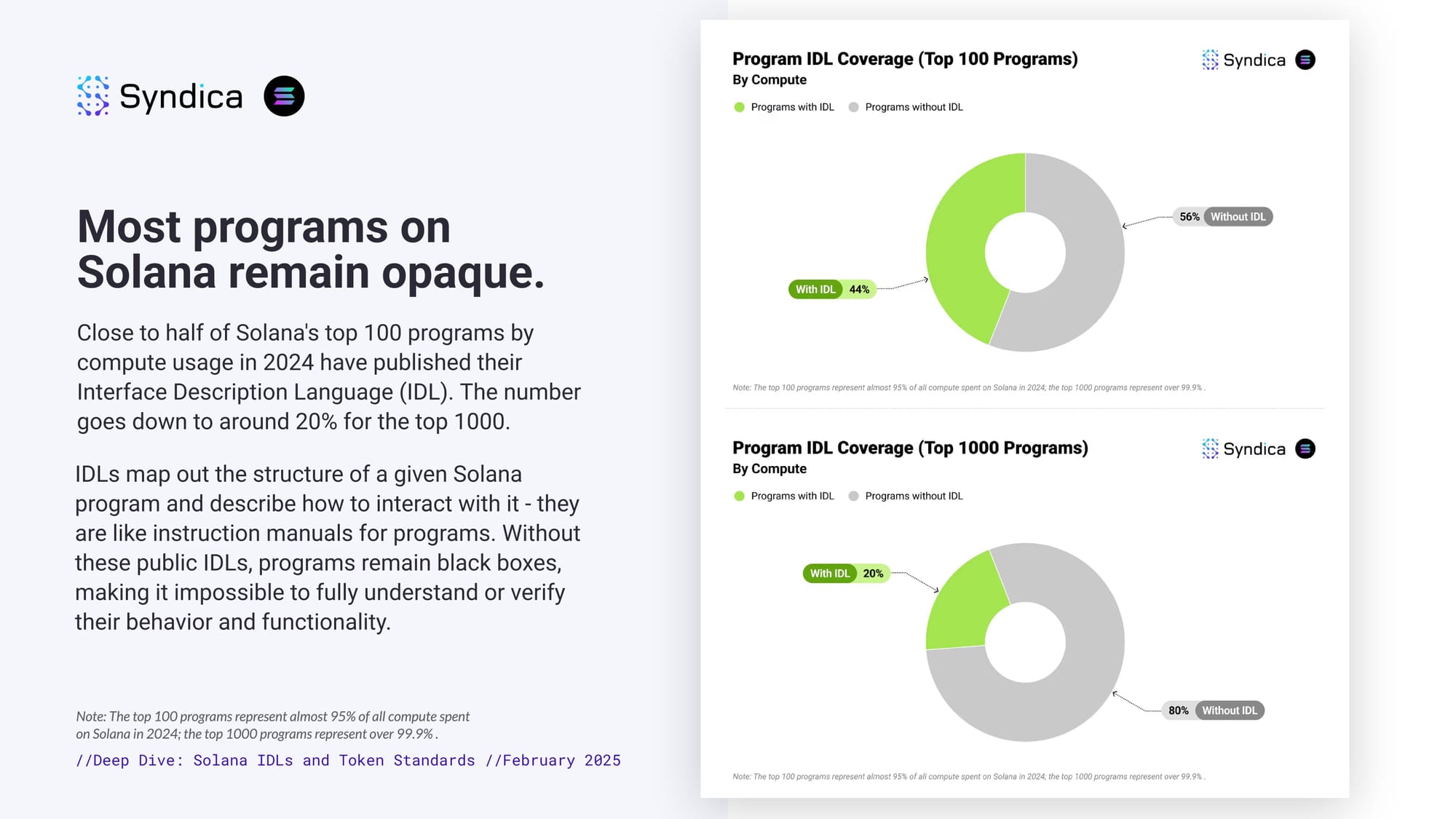 Most programs on Solana remain opaque. Close to half of Solana's top 100 programs by compute usage in 2024 have published their Interface Description Language (IDL). The number goes down to around 20% for the top 1000. IDLs map out the structure of a given Solana program and describe how to interact with it - they are like instruction manuals for programs. Without these public IDLs, programs remain black boxes, making it impossible to fully understand or verify their behavior and functionality.