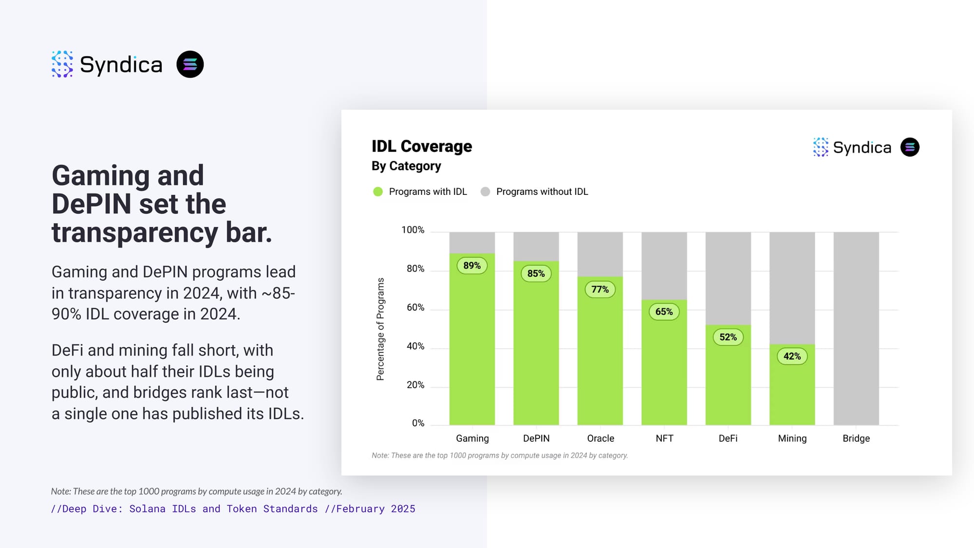 Gaming and DePIN set the transparency bar. Gaming and DePIN programs lead in transparency in 2024, with ~85-90% IDL coverage in 2024. DeFi and mining fall short, with only about half their IDLs being public, and bridges rank last—not a single one has published its IDLs.