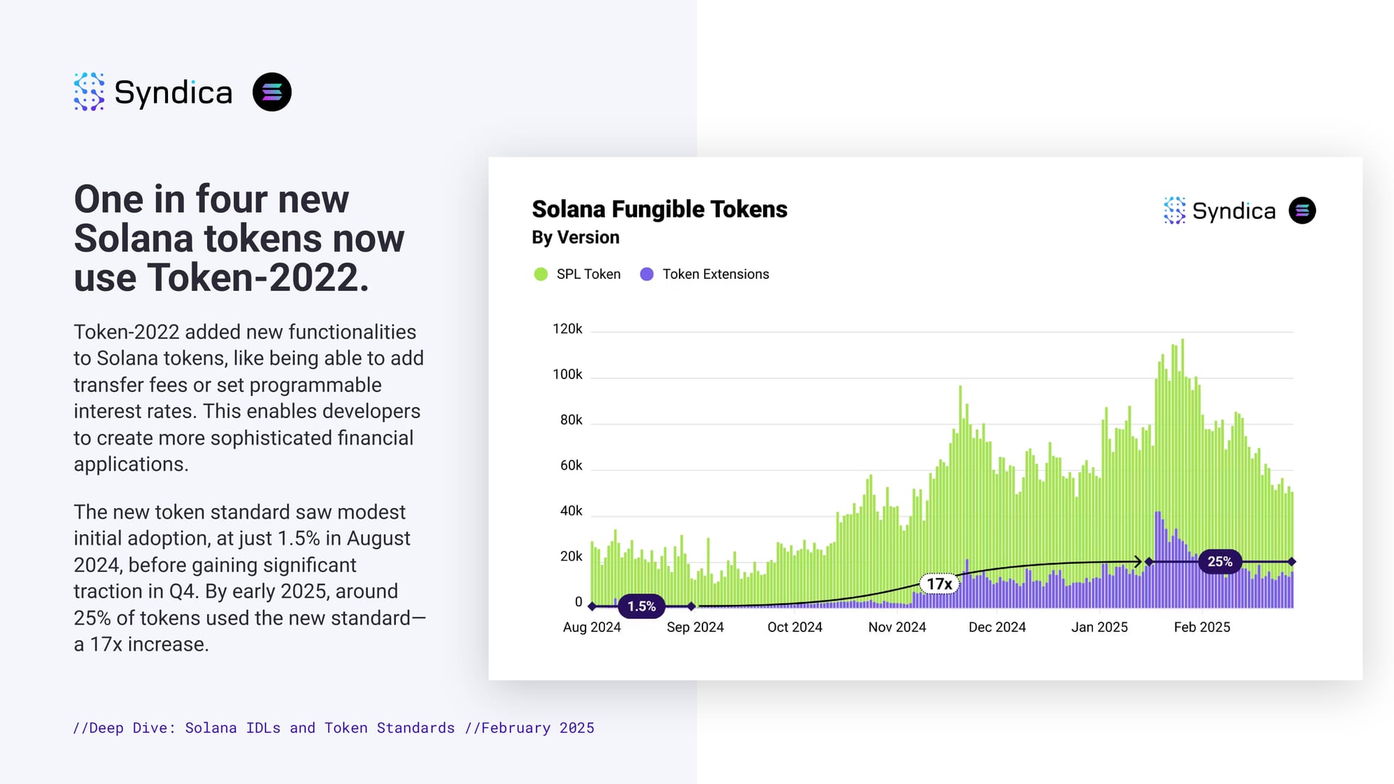 One in four new Solana tokens now use Token-2022. Token-2022 added new functionalities to Solana tokens, like being able to add transfer fees or set programmable interest rates. This enables developers to create more sophisticated financial applications. The new token standard saw modest initial adoption, at just 1.5% in August 2024, before gaining significant traction in Q4. By early 2025, around 25% of tokens used the new standard—a 17x increase.