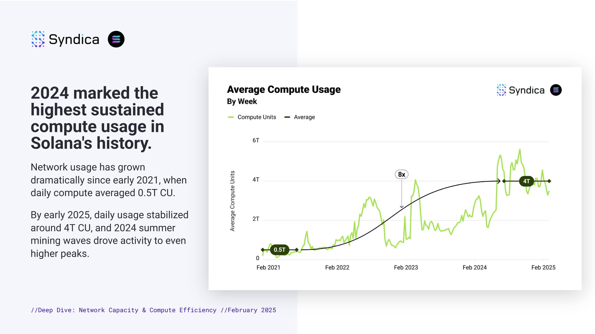 2024 marked the highest sustained compute usage in Solana's history. Network usage has grown dramatically since early 2021, when daily compute averaged 0.5T CU. By early 2025, daily usage stabilized around 4T CU, and 2024 summer mining waves drove activity to even higher peaks.