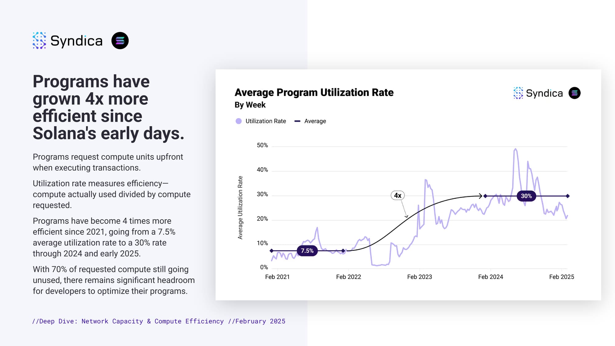 Programs have grown 4x more efficient since Solana's early days. Programs request compute units upfront when executing transactions. Utilization rate measures efficiency—compute actually used divided by compute requested. Programs have become 4 times more efficient since 2021, going from a 7.5% average utilization rate to a 30% rate through 2024 and early 2025. With 70% of requested compute still going unused, there remains significant headroom for developers to optimize their programs.