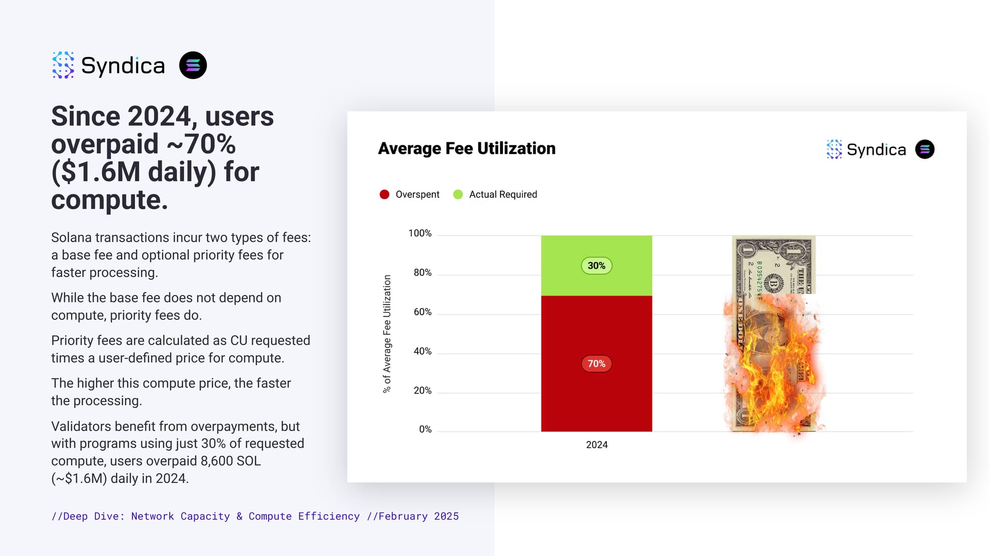 Since 2024, users overpaid ~70% ($1.6M daily) for compute. Solana transactions incur two types of fees: a base fee and optional priority fees for faster processing. While the base fee does not depend on compute, priority fees do. Priority fees are calculated as CU requested times a user-defined price for compute. The higher this compute price, the faster the processing. Validators benefit from overpayments, but with programs using just 30% of requested compute, users overpaid 8,600 SOL (~$1.6M) daily in 2024.