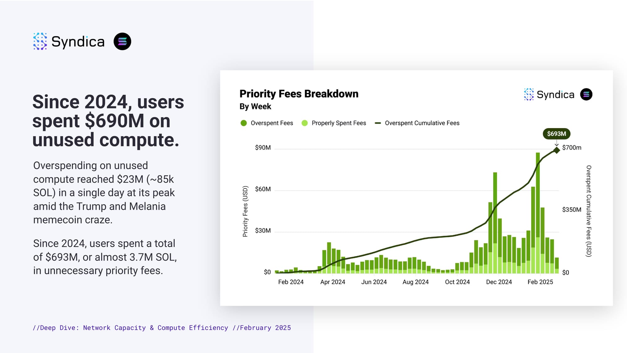 Since 2024, users spent $690M on unused compute. Overspending on unused compute reached $23M (~85k SOL) in a single day at its peak amid the Trump and Melania memecoin craze. Since 2024, users spent a total of $693M, or almost 3.7M SOL, in unnecessary priority fees.