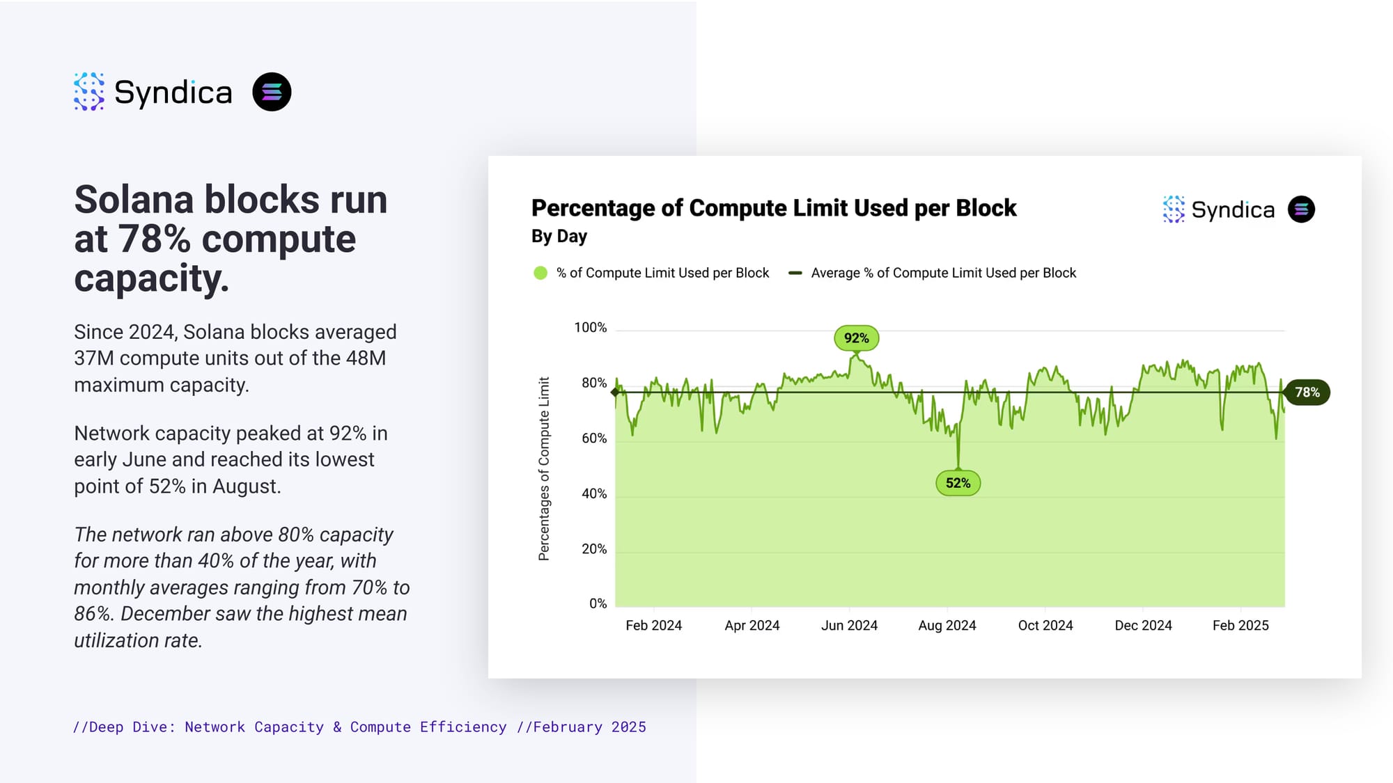 Solana blocks run at 78% compute capacity. Since 2024, Solana blocks averaged 37M compute units out of the 48M maximum capacity. Network capacity peaked at 92% in early June and reached its lowest point of 52% in August. The network ran above 80% capacity for more than 40% of the year, with monthly averages ranging from 70% to 86%. December saw the highest mean utilization rate.
